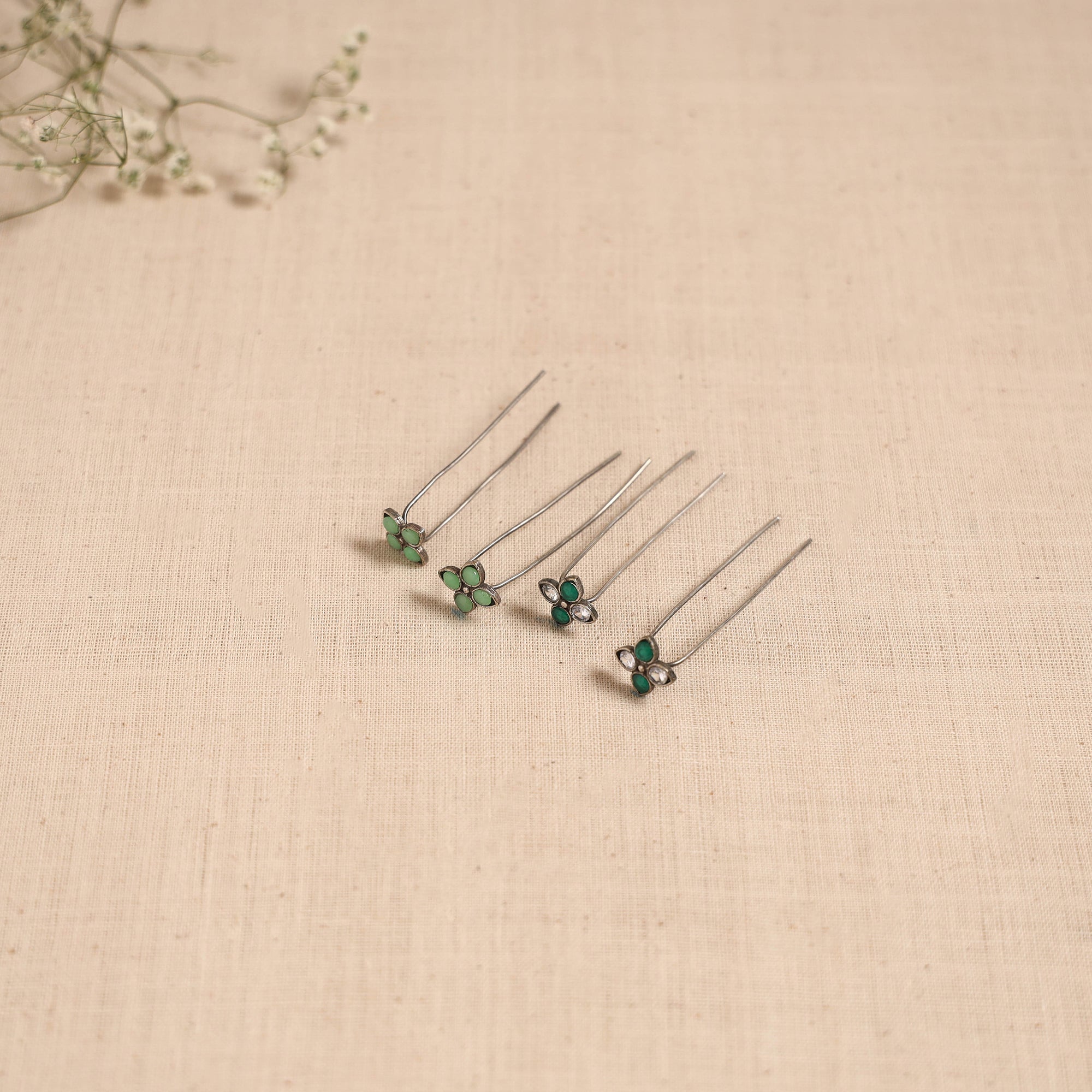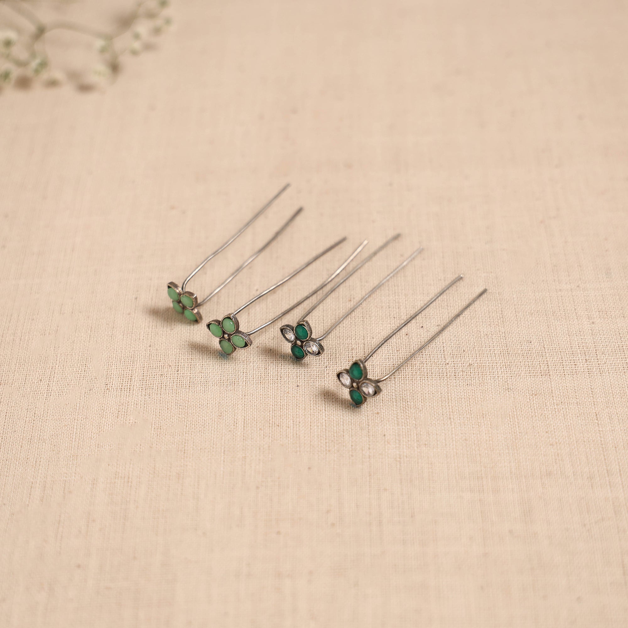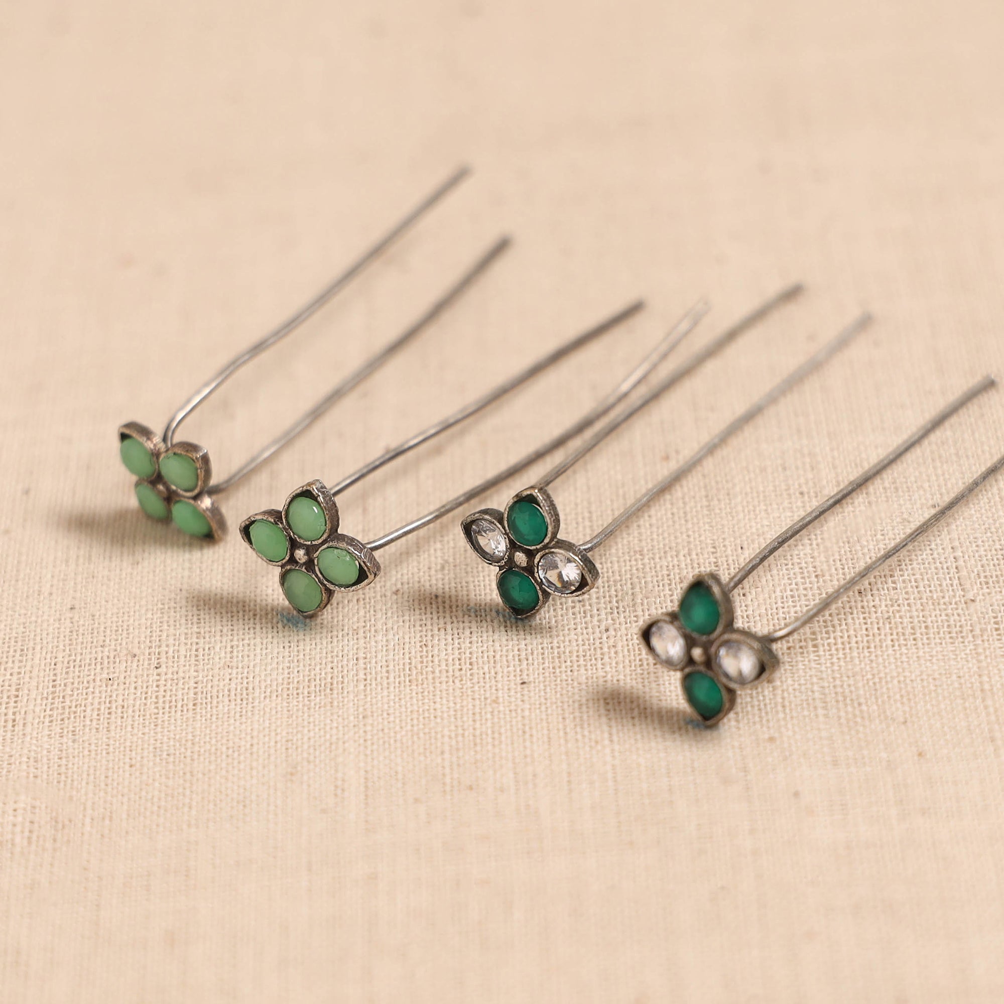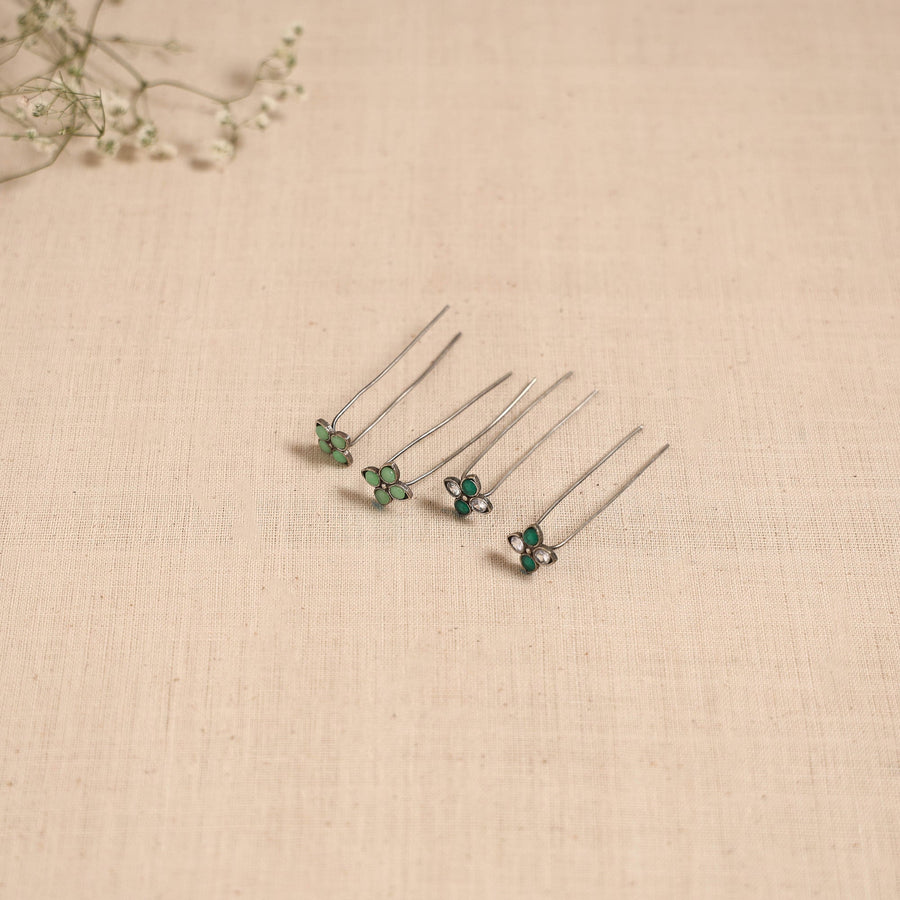 This elegant green antique silver finish juda pin set is crafted from oxidised brass and decorated with beautiful stone work. Its rustic shine gives it a classic, timeless charm. Perfect for weddings, festive looks, or everyday elegance, this hair accessory adds a graceful touch to any hairstyle with its unique traditional appeal.