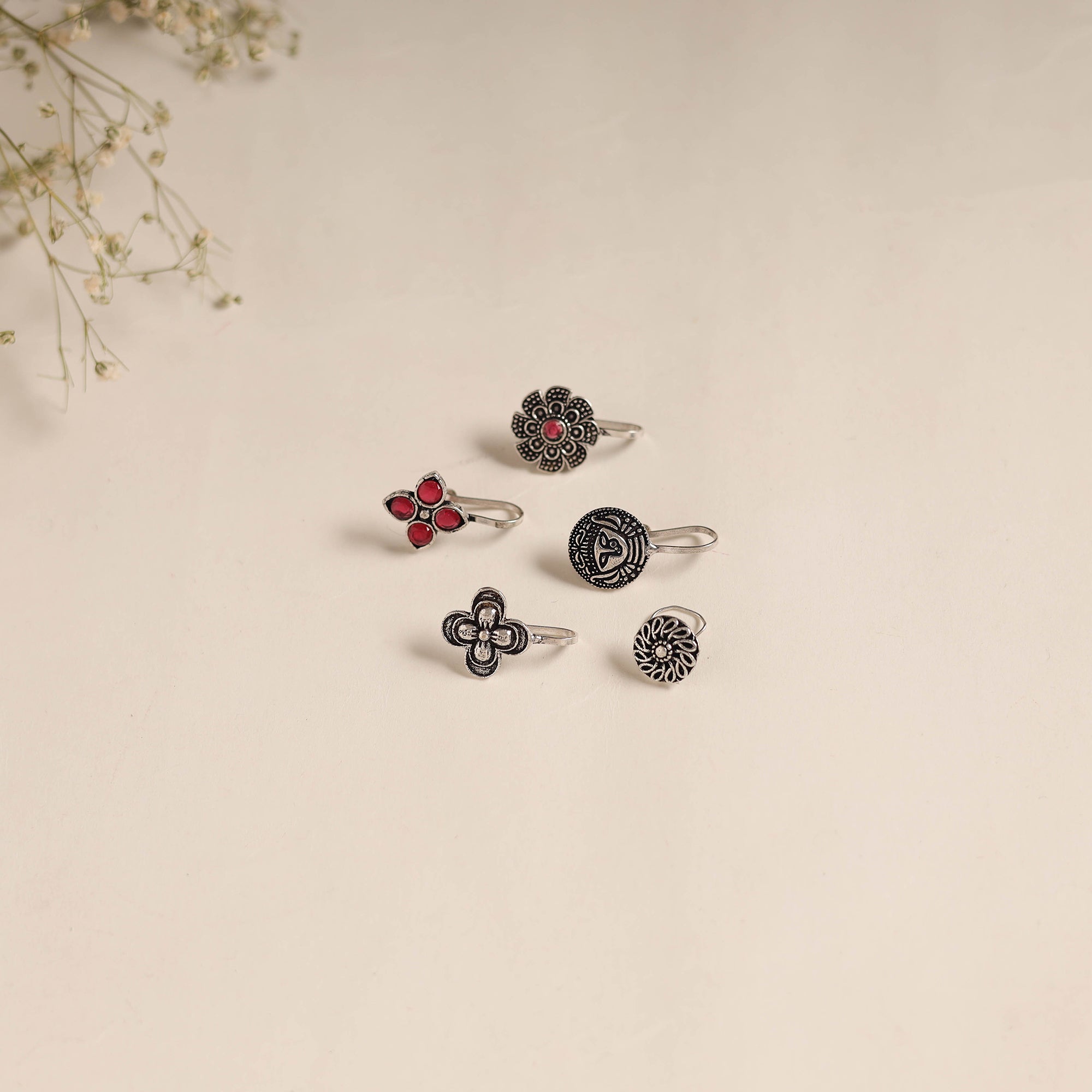 This oxidised silver finish nosepin showcases fine detailing with delicate stone accents that lend it a distinct charm. Its versatile design complements both traditional and contemporary outfits, adding a graceful touch to your look effortlessly.