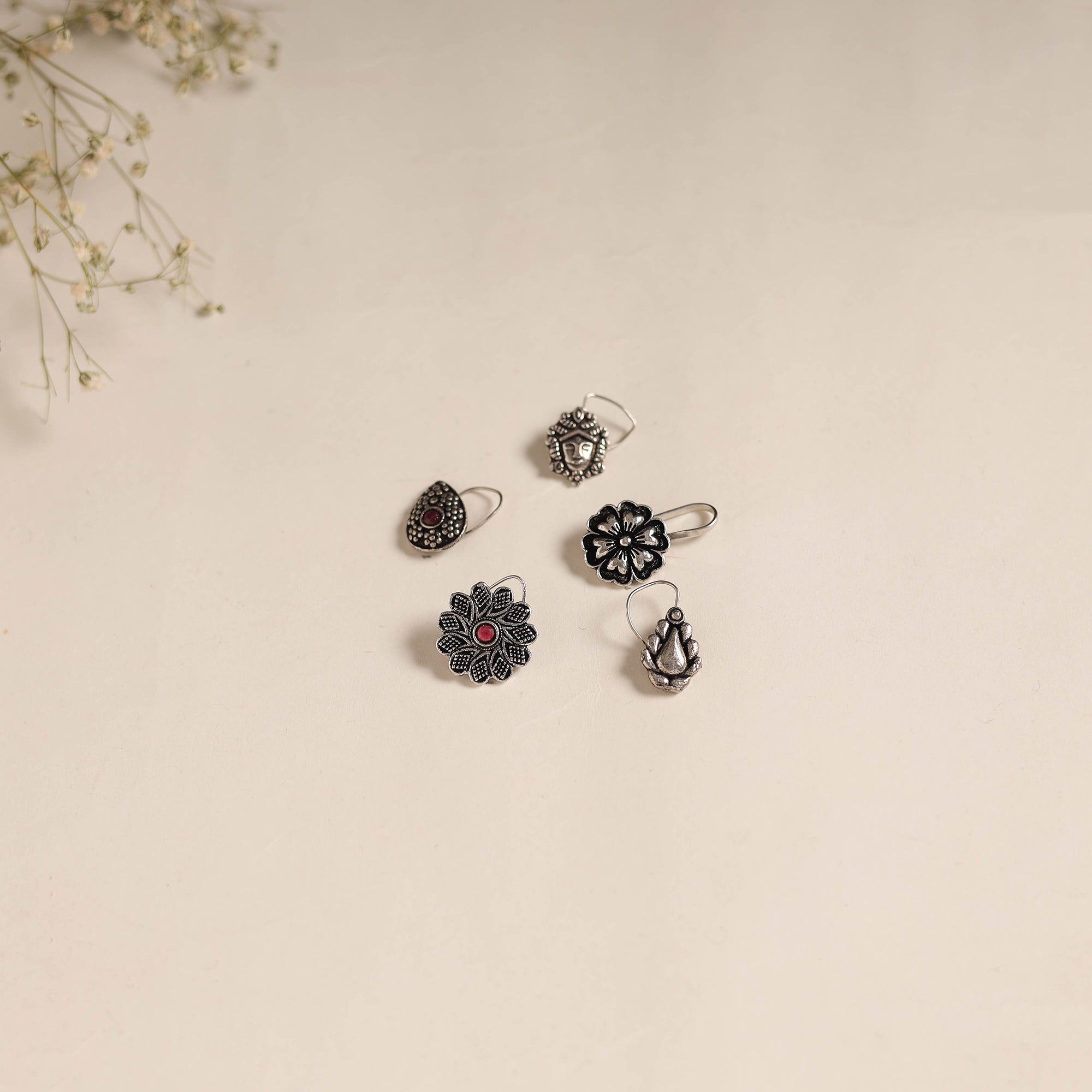 This oxidised silver finish nosepin showcases fine detailing with delicate stone accents that lend it a distinct charm. Its versatile design complements both traditional and contemporary outfits, adding a graceful touch to your look effortlessly.