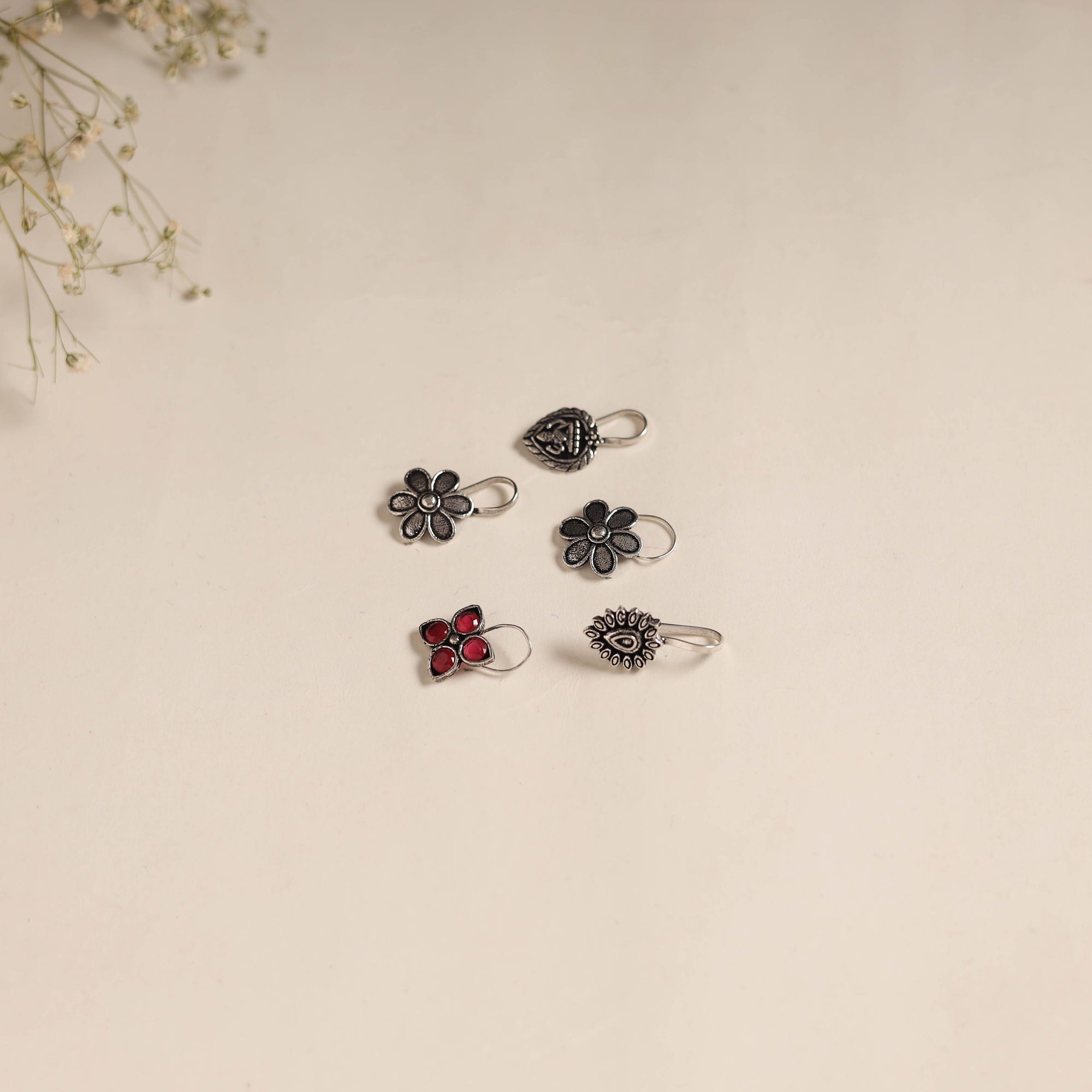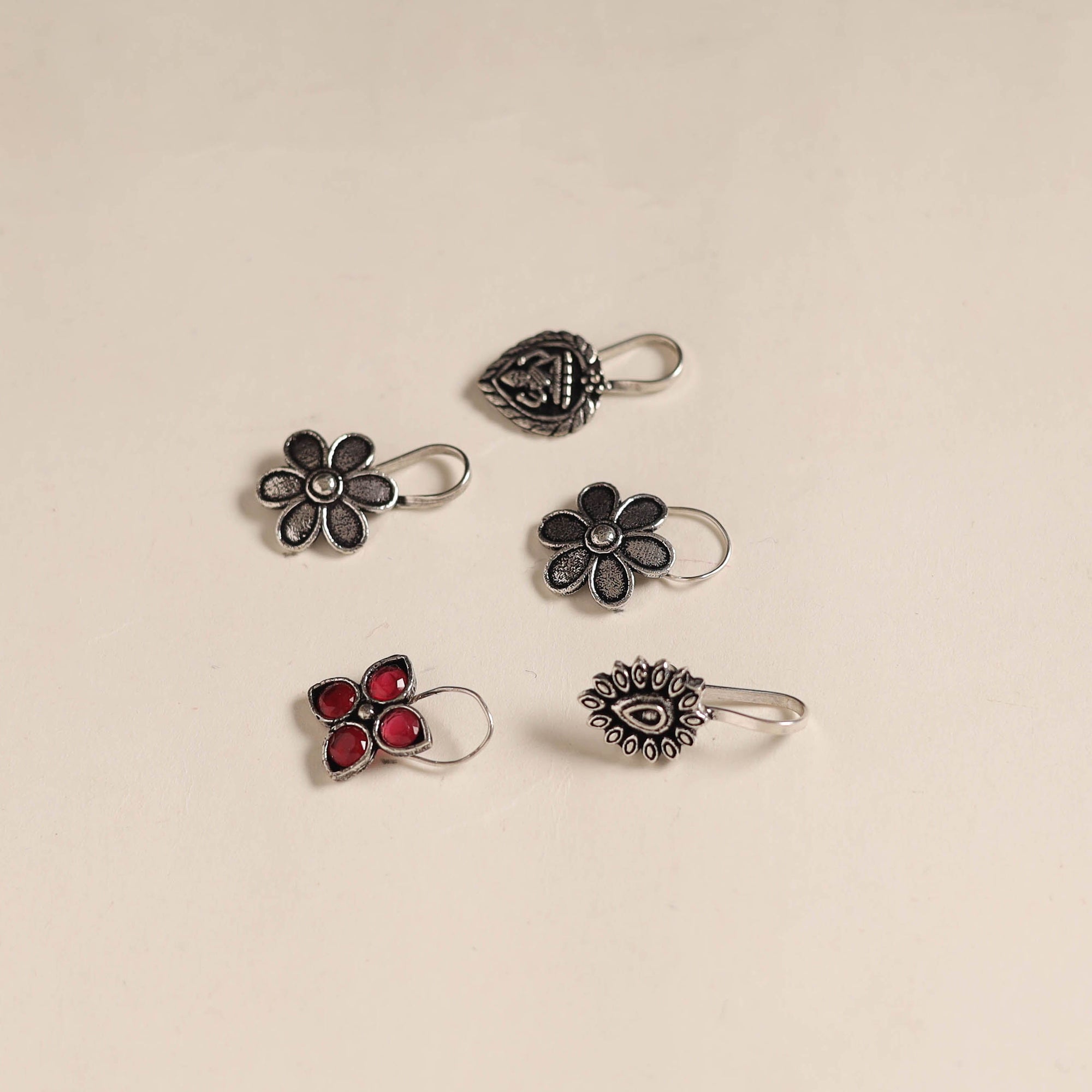This oxidised silver finish nosepin showcases fine detailing with delicate stone accents that lend it a distinct charm. Its versatile design complements both traditional and contemporary outfits, adding a graceful touch to your look effortlessly.