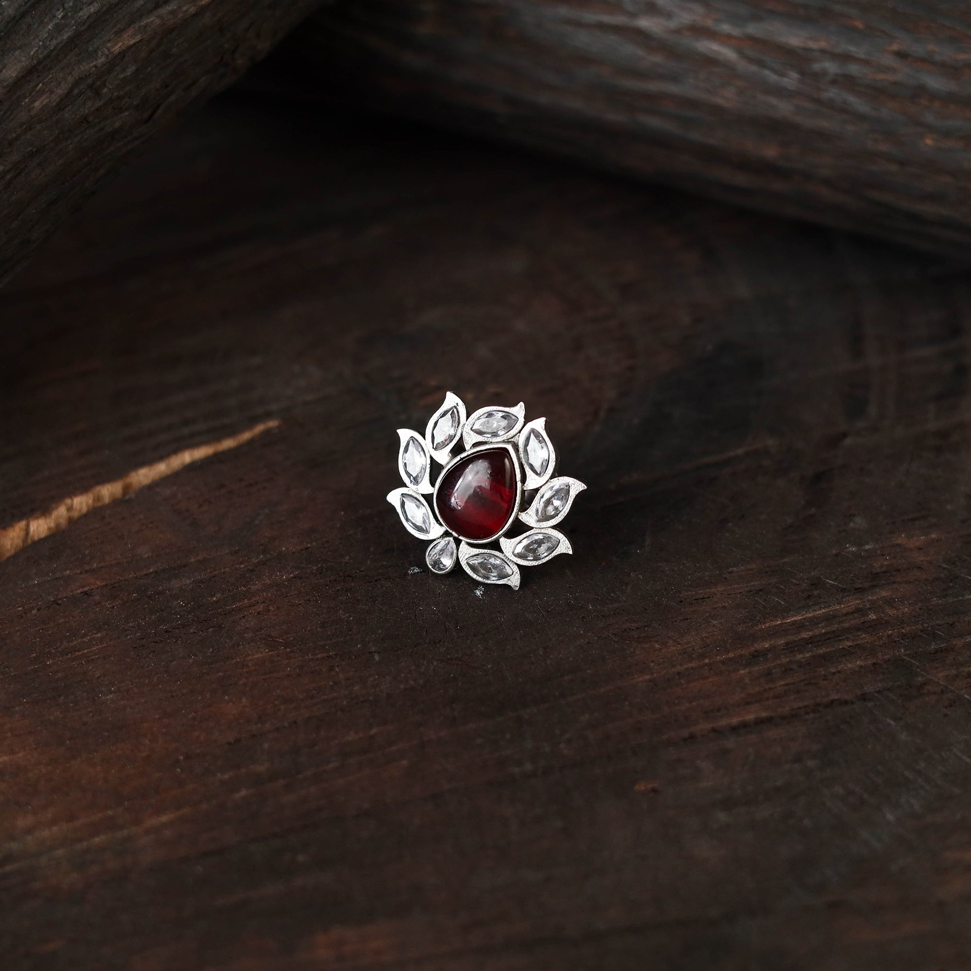 This red antique silver finish oxidised stonework ring features fine detailing with a rustic charm. Designed to complement both ethnic and modern outfits, it adds a distinctive edge to your jewellery collection. Lightweight and easy to wear, this ring brings a graceful touch that elevates your style for any occasion.