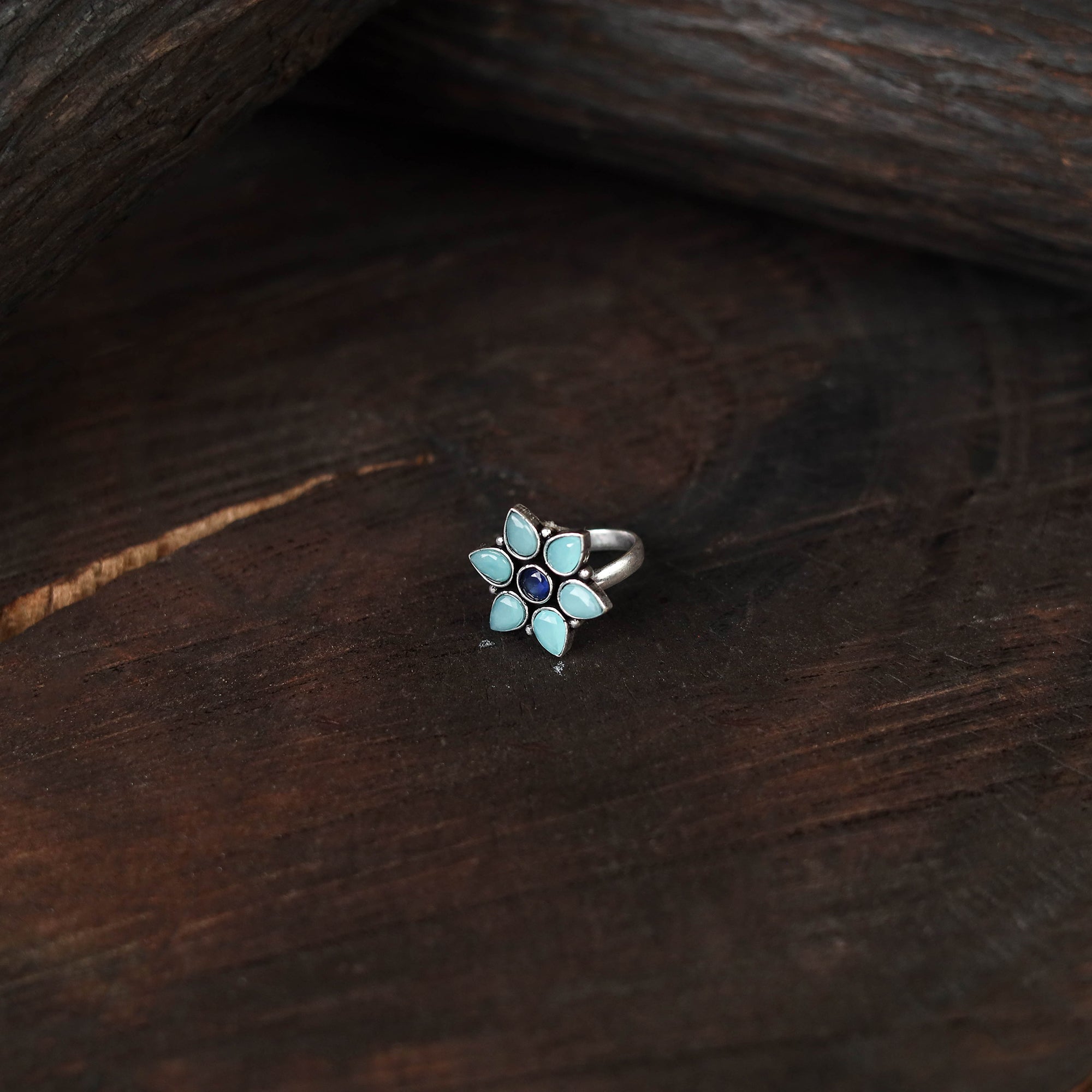 This blue antique silver finish oxidised stonework ring features fine detailing with a rustic charm. Designed to complement both ethnic and modern outfits, it adds a distinctive edge to your jewellery collection. Lightweight and easy to wear, this ring brings a graceful touch that elevates your style for any occasion.