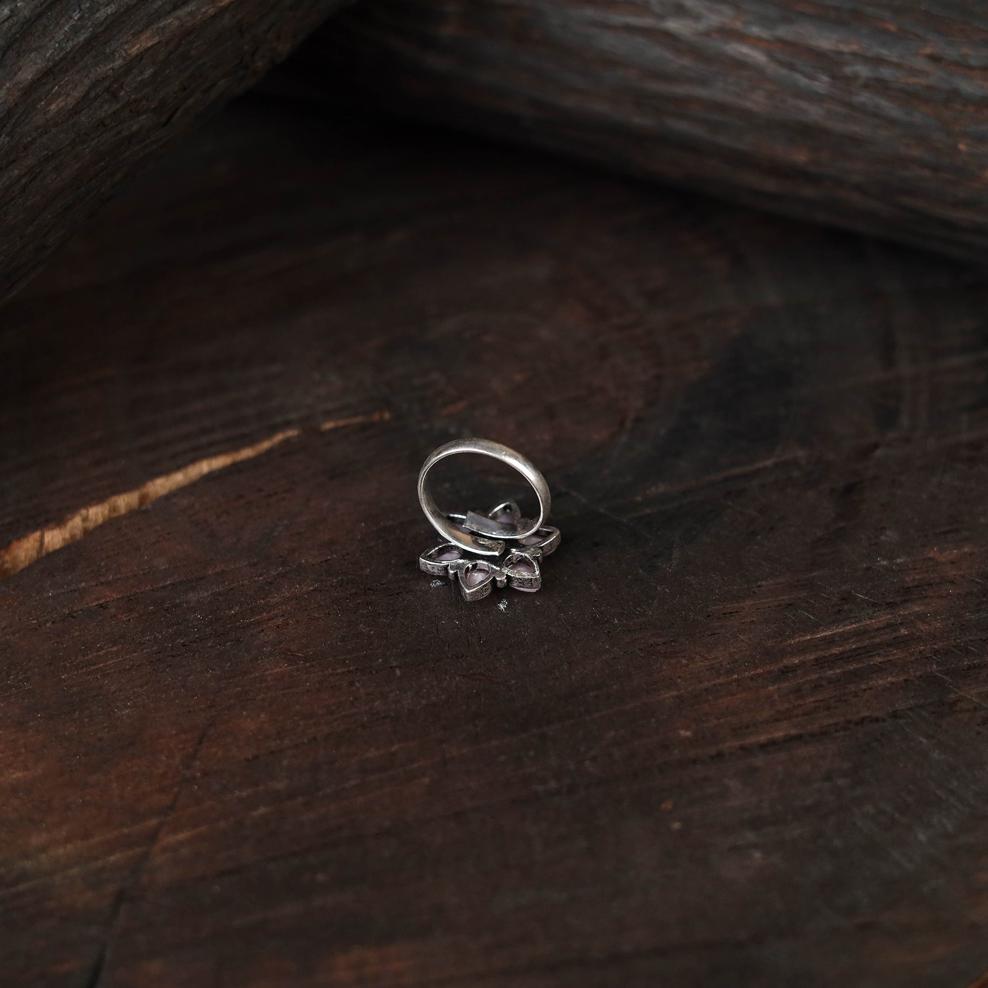 This pink antique silver finish oxidised stonework ring features fine detailing with a rustic charm. Designed to complement both ethnic and modern outfits, it adds a distinctive edge to your jewellery collection. Lightweight and easy to wear, this ring brings a graceful touch that elevates your style for any occasion.