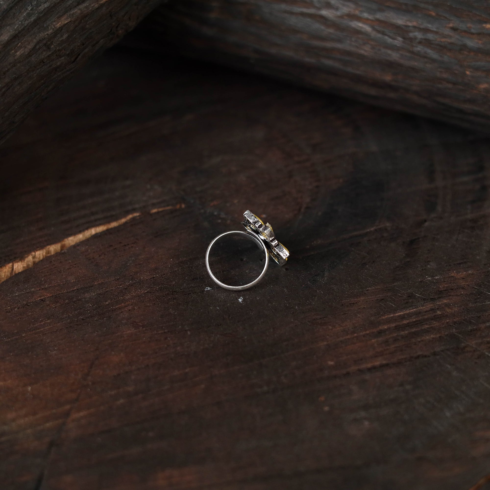 This yellow antique silver finish oxidised stonework ring features fine detailing with a rustic charm. Designed to complement both ethnic and modern outfits, it adds a distinctive edge to your jewellery collection. Lightweight and easy to wear, this ring brings a graceful touch that elevates your style for any occasion.