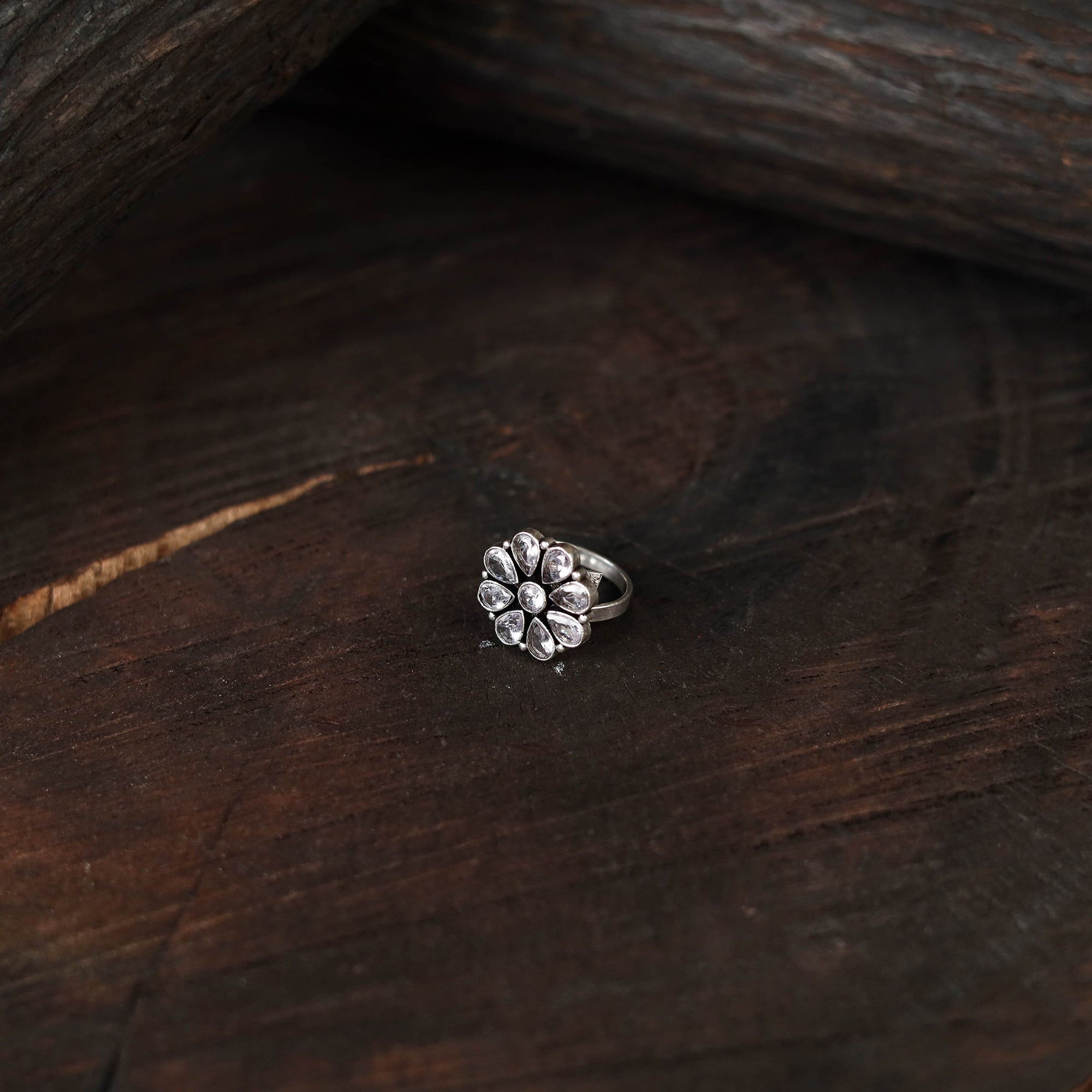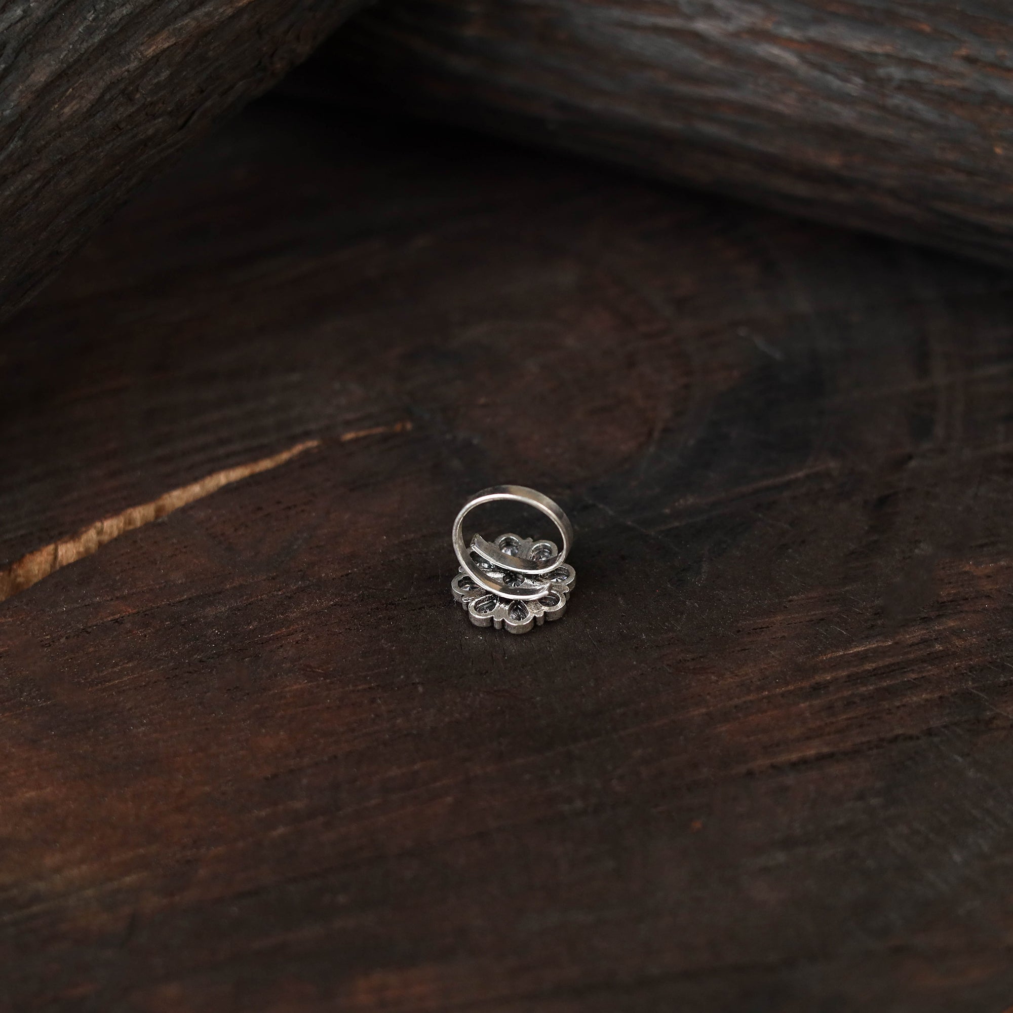 This white antique silver finish oxidised stonework ring features fine detailing with a rustic charm. Designed to complement both ethnic and modern outfits, it adds a distinctive edge to your jewellery collection. Lightweight and easy to wear, this ring brings a graceful touch that elevates your style for any occasion.