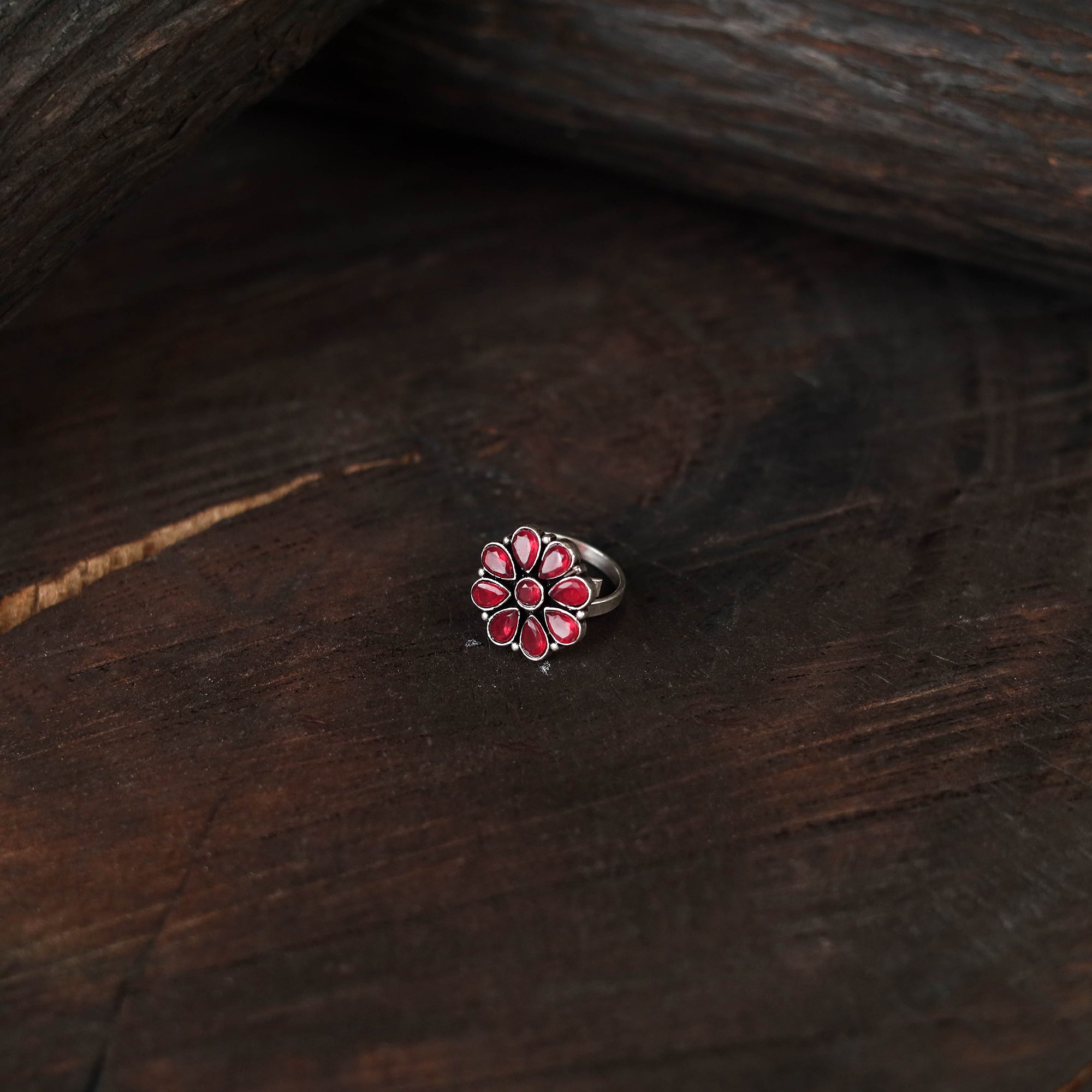 This red antique silver finish oxidised stonework ring features fine detailing with a rustic charm. Designed to complement both ethnic and modern outfits, it adds a distinctive edge to your jewellery collection. Lightweight and easy to wear, this ring brings a graceful touch that elevates your style for any occasion.