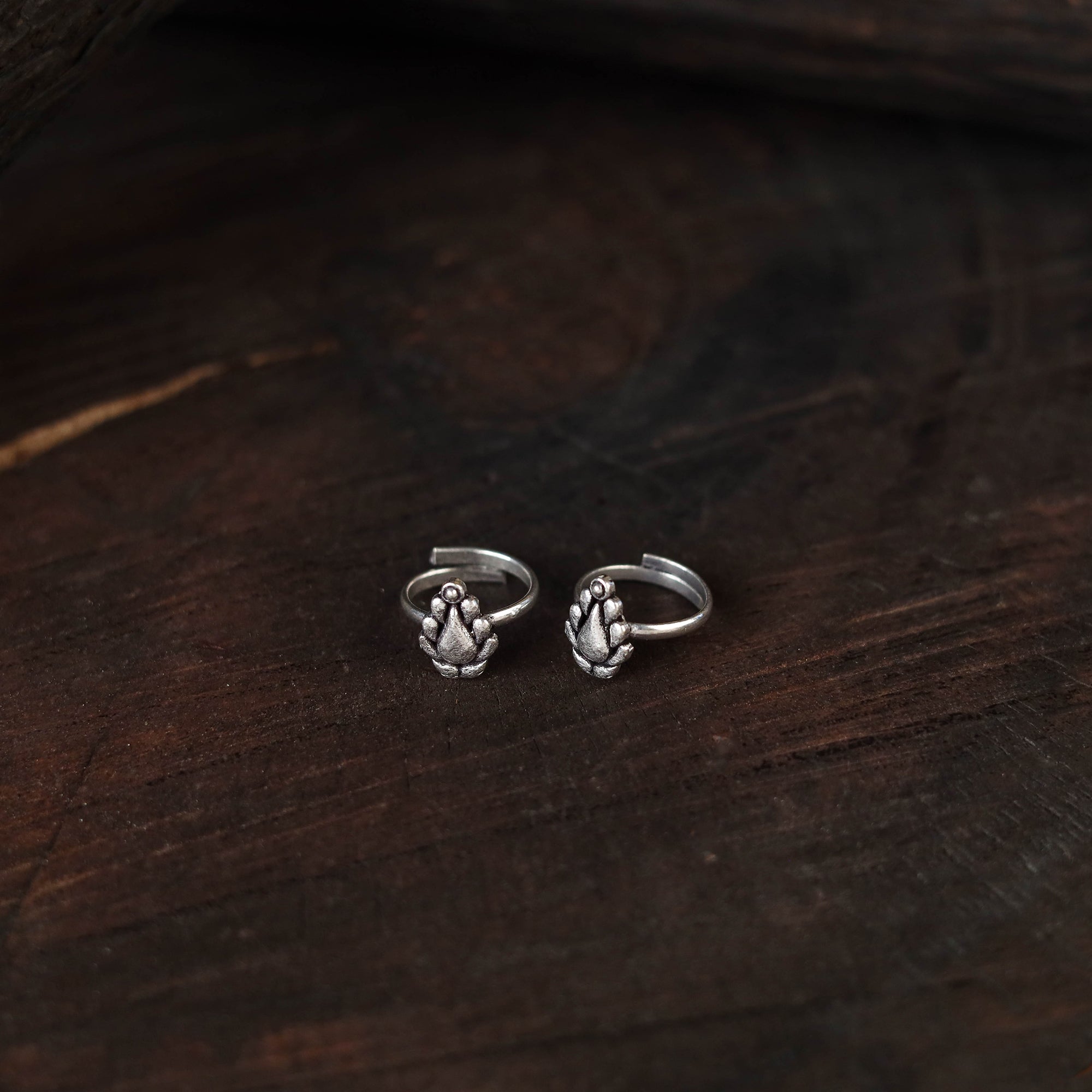 These grey antique silver finish oxidised toe rings feature intricate detailing with a rustic charm. Their versatile design pairs beautifully with both ethnic and contemporary outfits, making them a subtle yet striking addition to your jewellery collection. Comfortable to wear, they bring effortless elegance and enhance your overall look.
