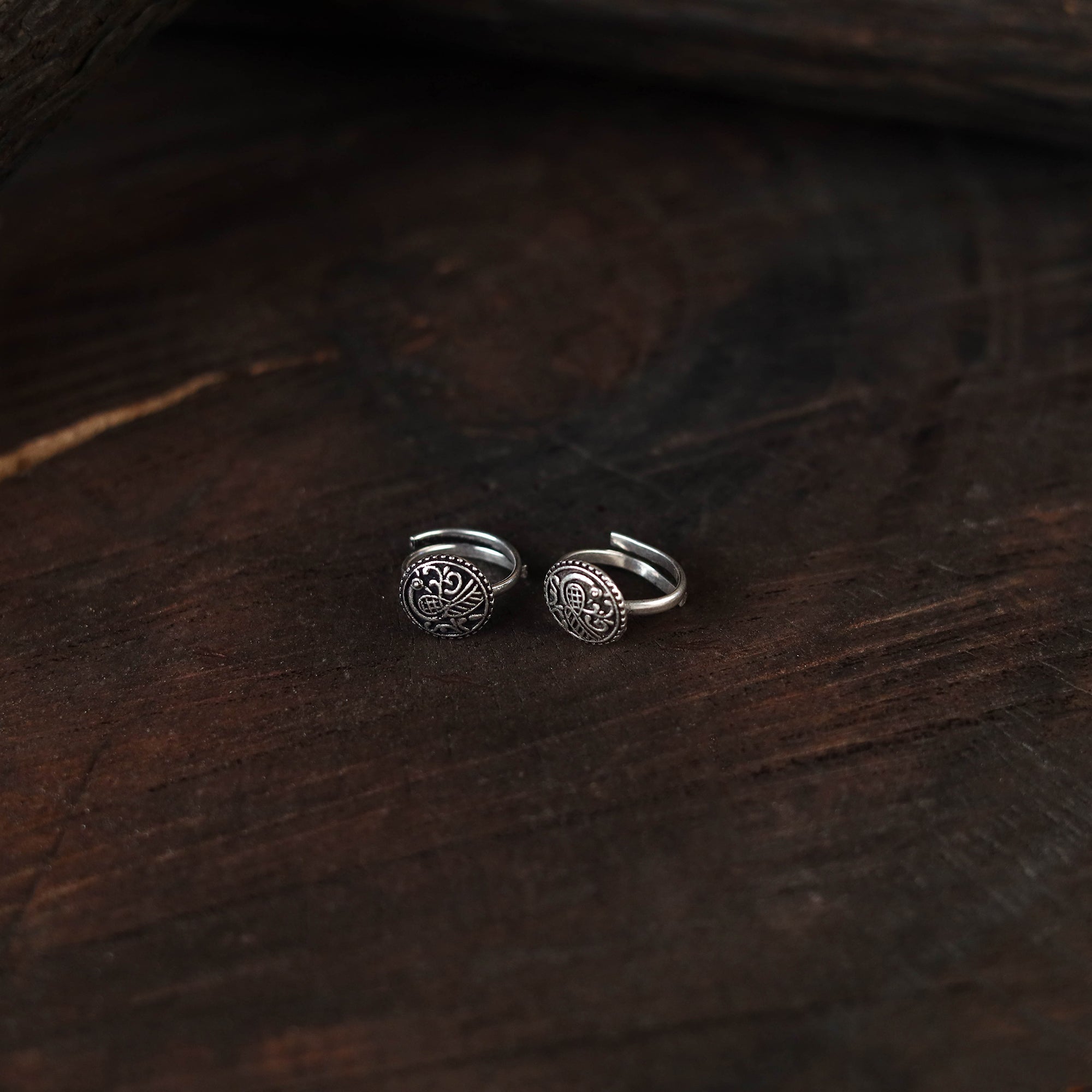 These grey antique silver finish oxidised toe rings feature intricate detailing with a rustic charm. Their versatile design pairs beautifully with both ethnic and contemporary outfits, making them a subtle yet striking addition to your jewellery collection. Comfortable to wear, they bring effortless elegance and enhance your overall look.