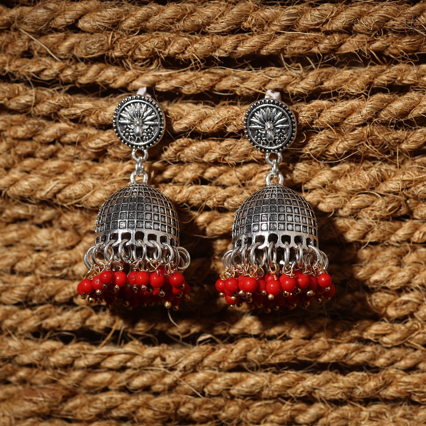 Grey handcrafted gs beaded jhumki earrings. Crafted from oxidised german silver adorned with intricate bead work. Perfect for casual outings or festive celebrations they make a versatile addition to any jewelry collection.
