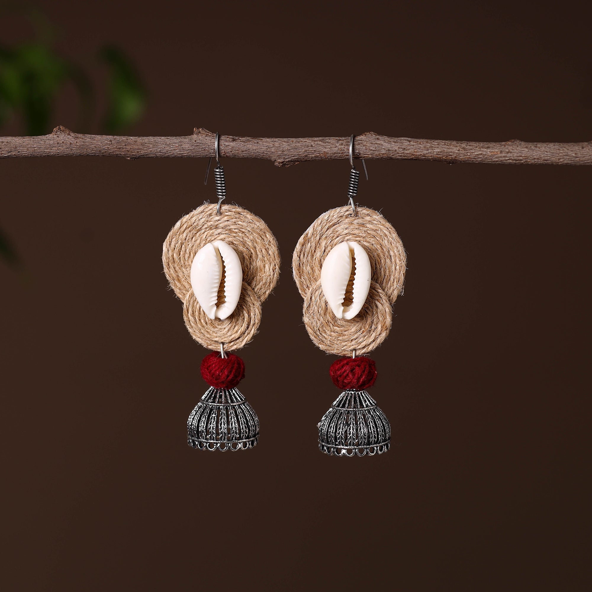 Material  These beige handcrafted german silver jute jhumki earrings. Featuring intricate jute, seashell, and thread detailing, these earrings add a unique and vibrant touch to your look. Perfect for casual wear or festive occasions.