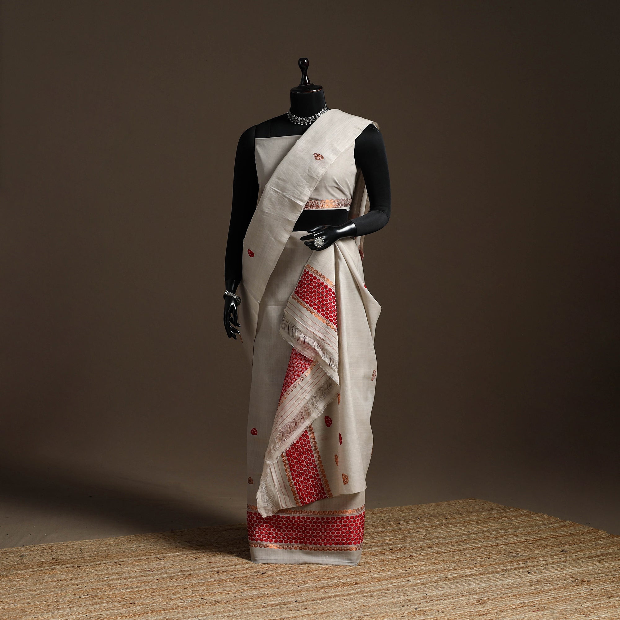 Beige assam handloom mekhela chador comes with a blouse piece. The ensemble includes a beautifully woven chador, a matching mekhela and a blouse piece. Expertly crafted using a unique blend of cotton and raw mulberry silk, it offers both comfort and a refined texture. It is usually adorned with woven designs, often featuring motifs inspired by nature, such as flowers, birds and other traditional patterns. Perfect for cultural events or special occasions.