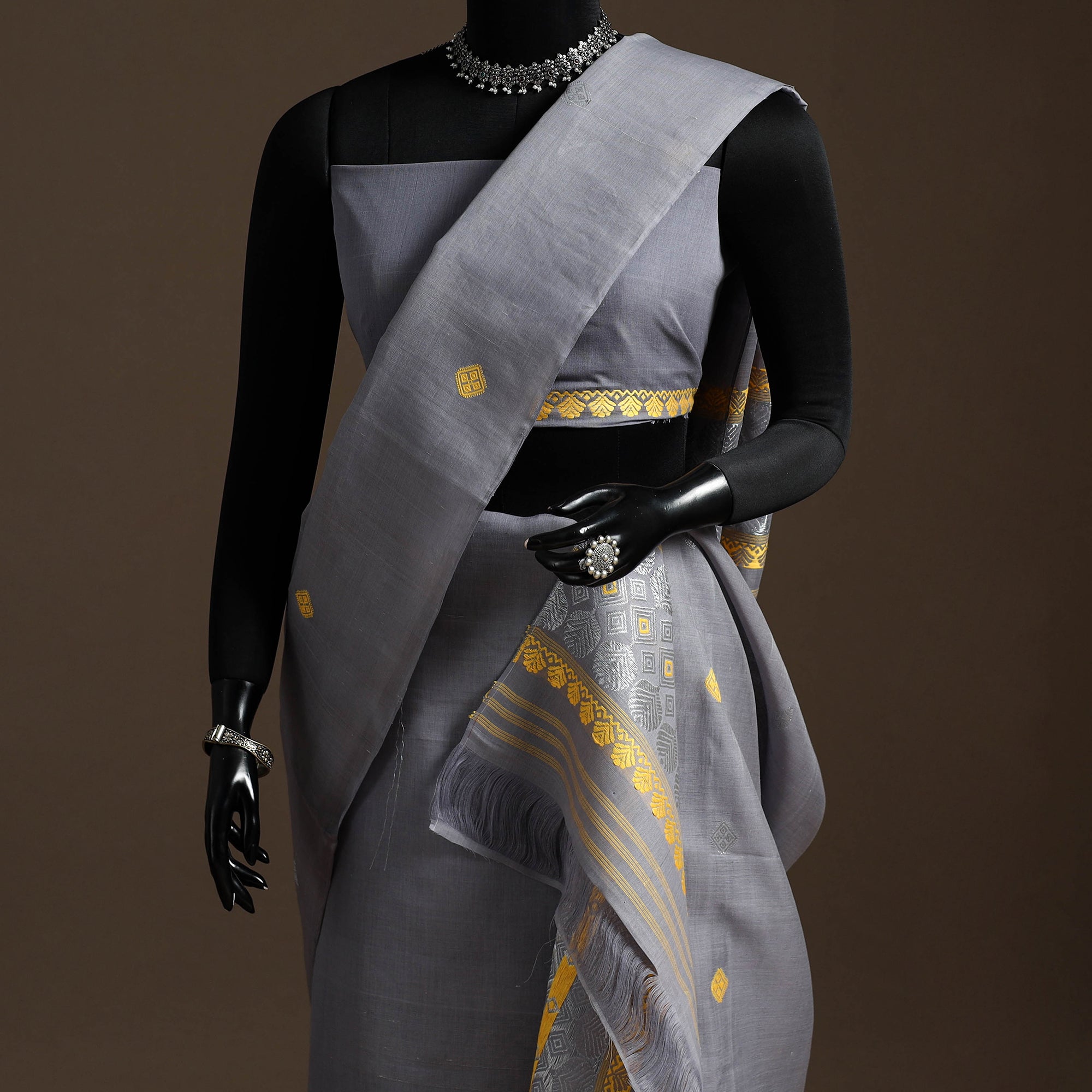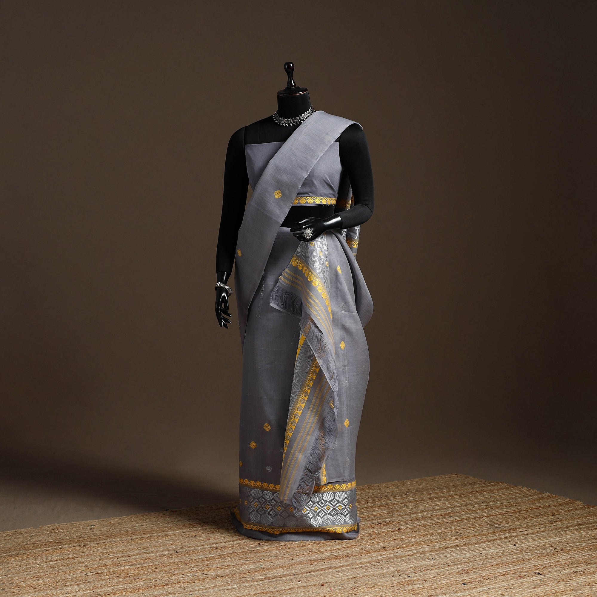 Grey assam handloom mekhela chador comes with a blouse piece. The ensemble includes a beautifully woven chador, a matching mekhela and a blouse piece. Expertly crafted using a unique blend of cotton and raw mulberry silk, it offers both comfort and a refined texture. It is usually adorned with woven designs, often featuring motifs inspired by nature, such as flowers, birds and other traditional patterns. Perfect for cultural events or special occasions.