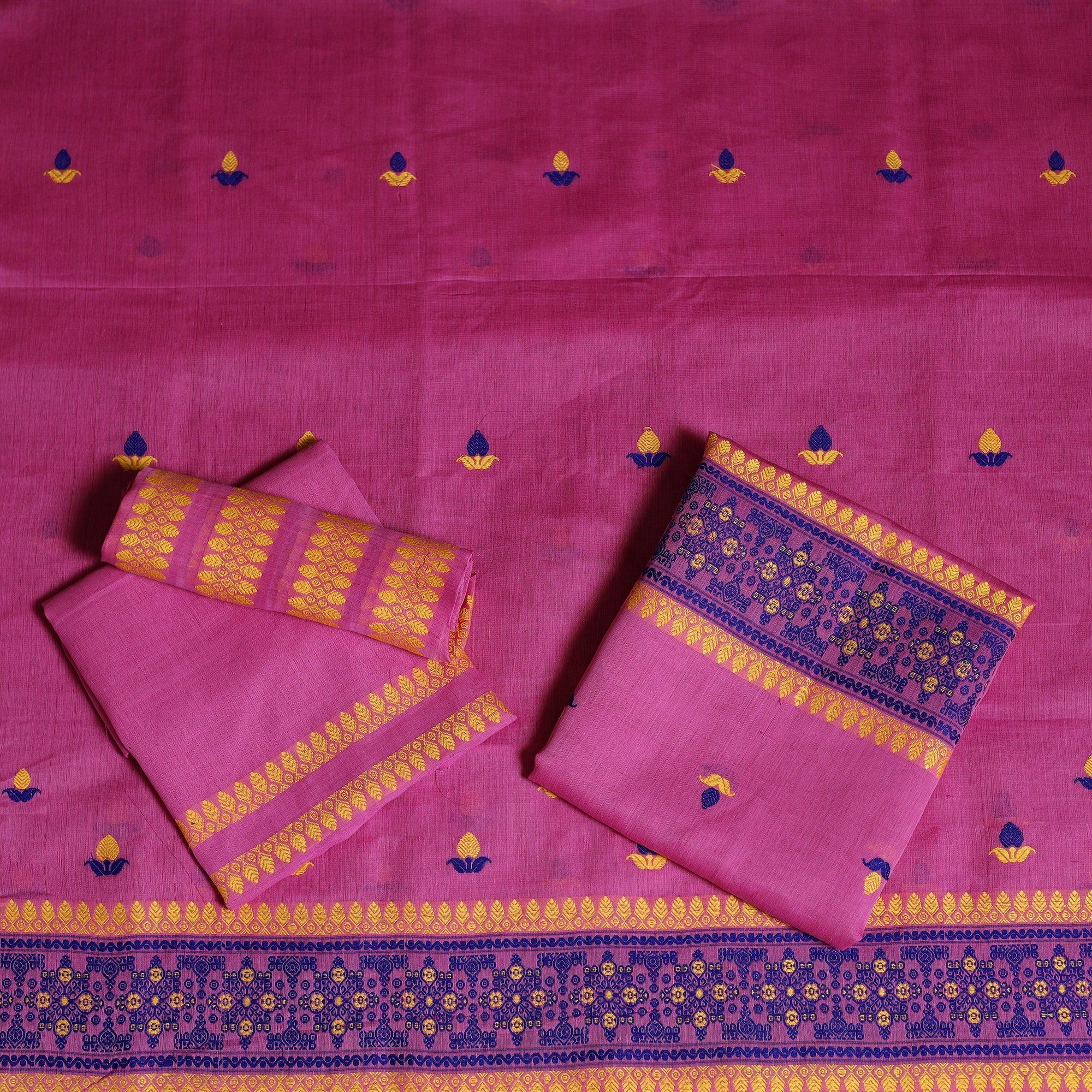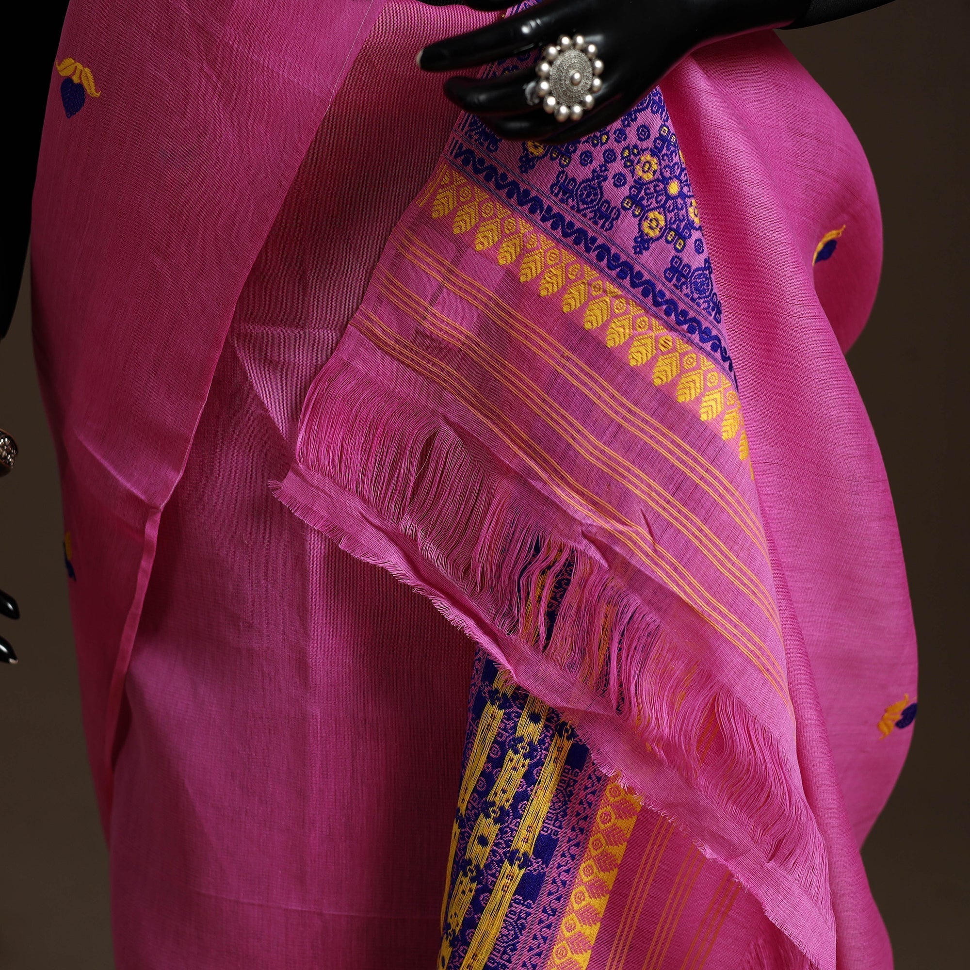 Pink assam handloom mekhela chador comes with a blouse piece. The ensemble includes a beautifully woven chador, a matching mekhela and a blouse piece. Expertly crafted using a unique blend of cotton and raw mulberry silk, it offers both comfort and a refined texture. It is usually adorned with woven designs, often featuring motifs inspired by nature, such as flowers, birds and other traditional patterns. Perfect for cultural events or special occasions.
