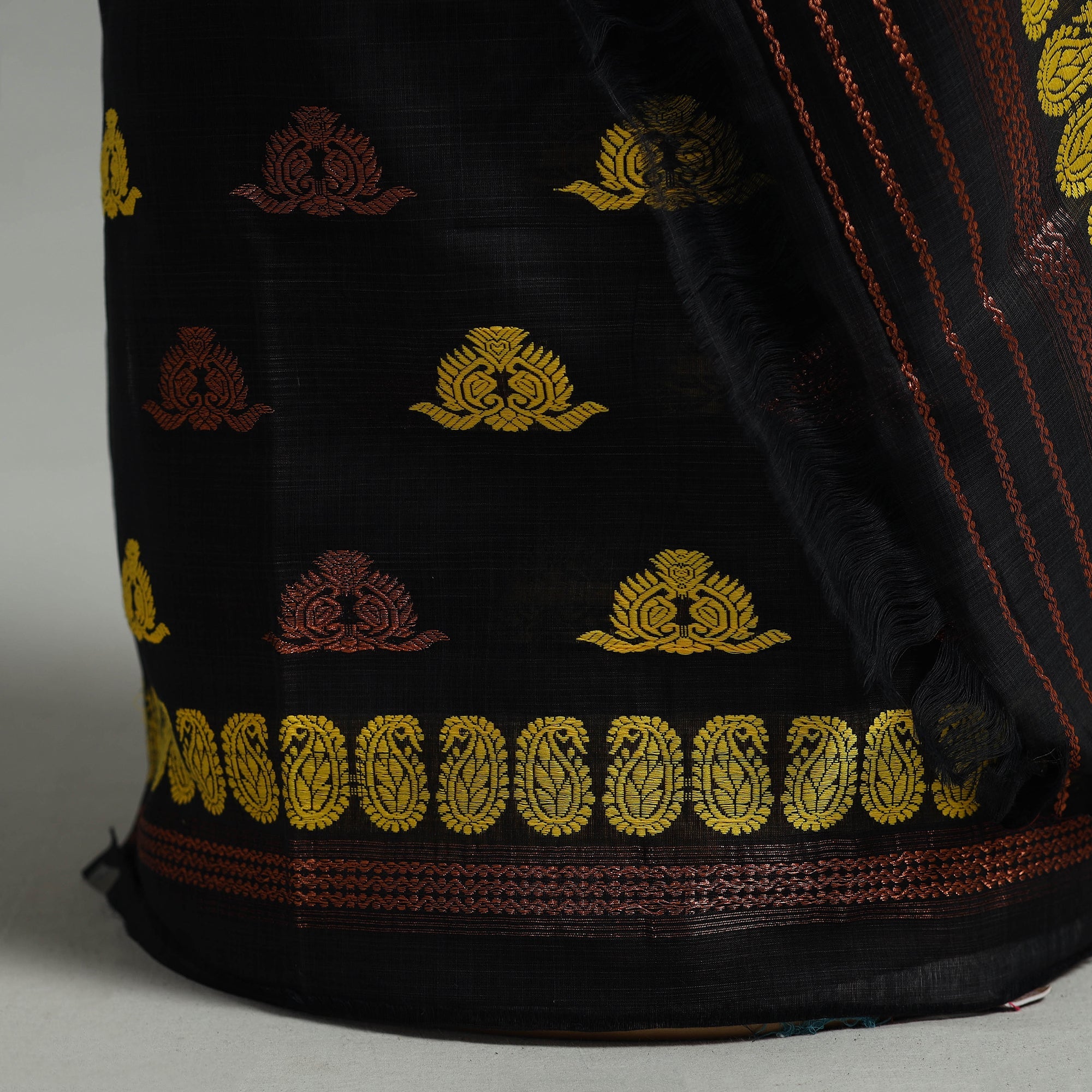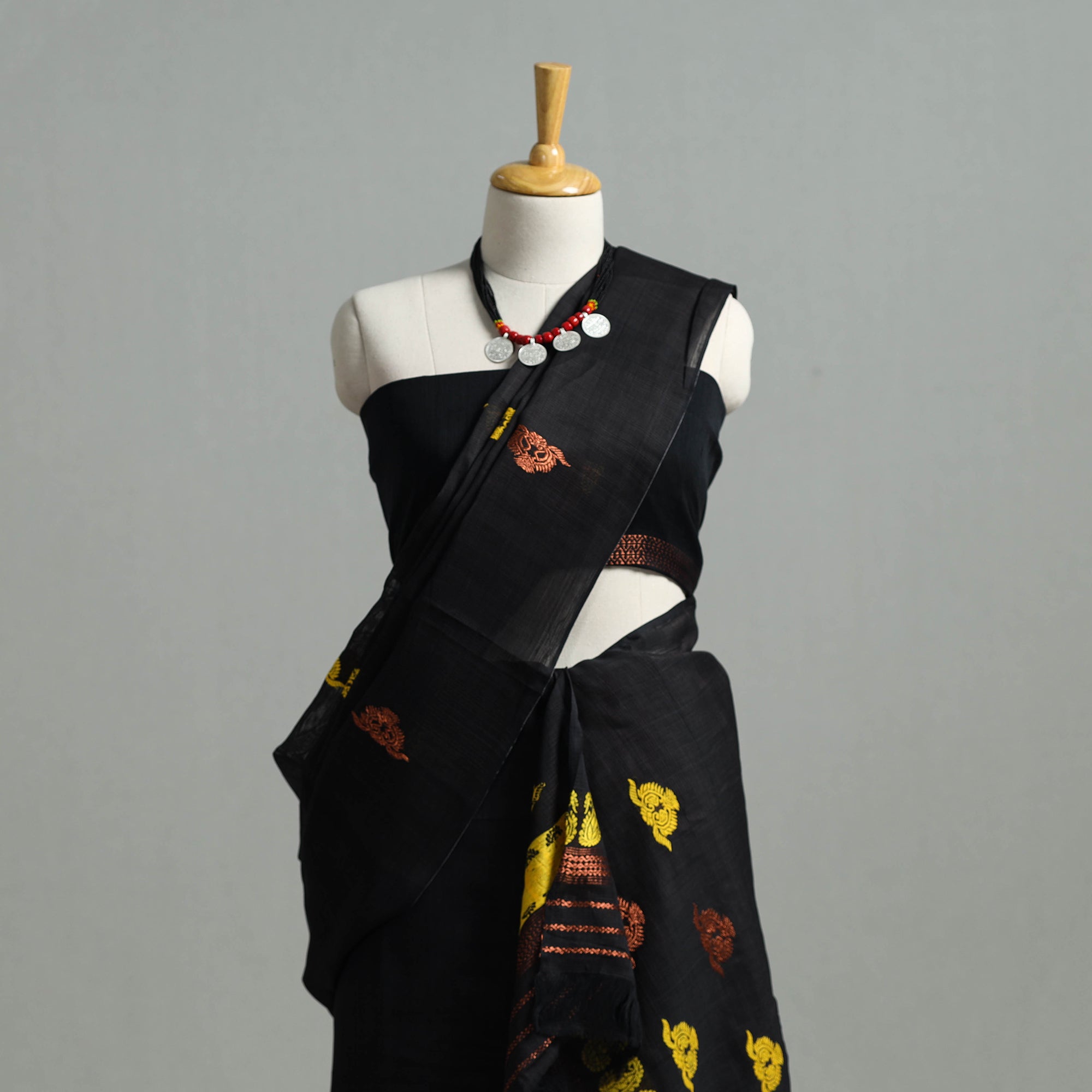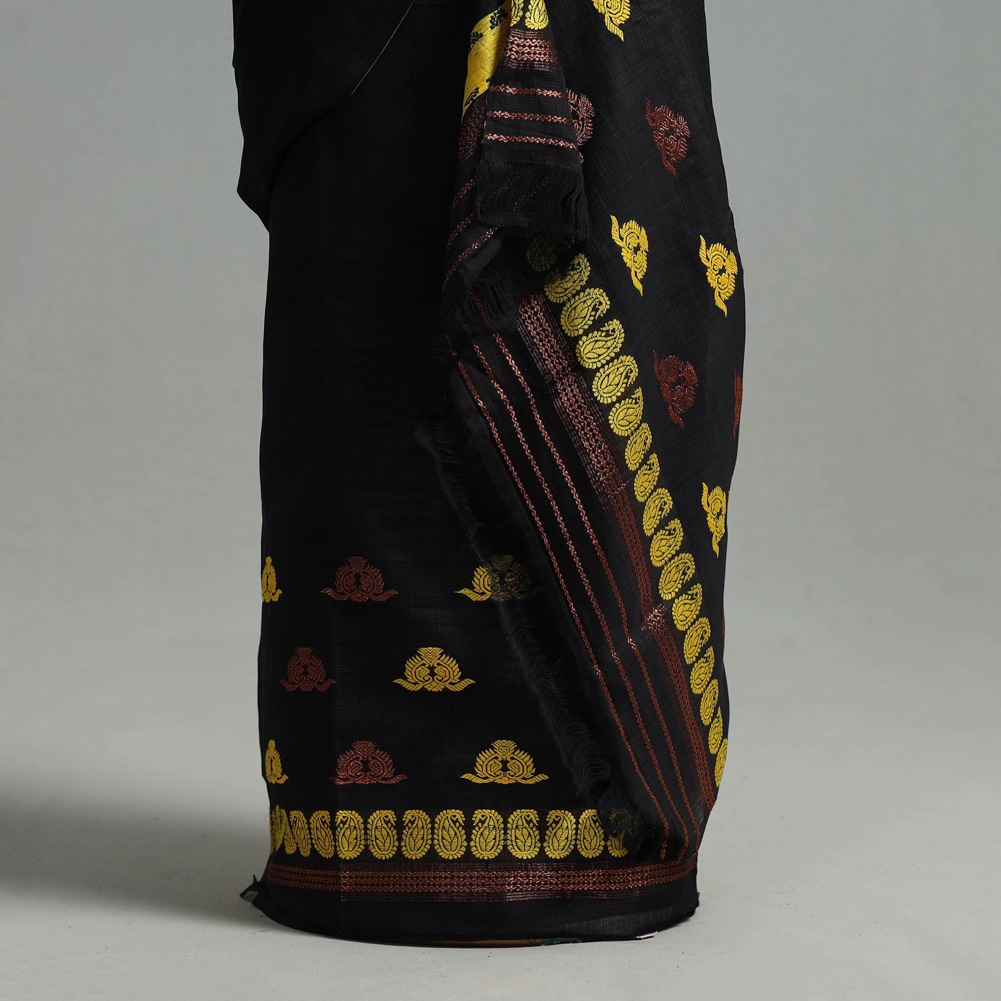 This assam black handloom tussar mekhela chador with blouse piece. This ensemble includes a beautifully woven chador, a matching mekhela, and a blouse piece. It is usually adorned with handwoven designs, often featuring motifs inspired by nature, such as flowers, birds, and other traditional patterns. Perfect for cultural events or special occasions.