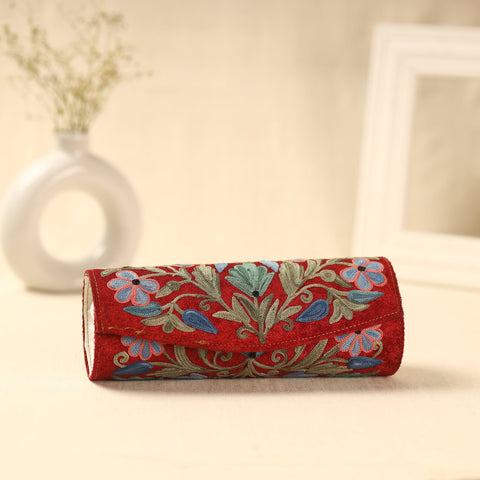 Organised your daily essentials with artisanal charm with our authentic red kashmiri crewel hand embroidery velvet clutch/purse. This exquisite clutch purse showcases authentic kashmiri crewel embroidery, a thousand-year-old art form known for its intricate beauty. Made with rich wool & silk yarn on velvet, with an interior two zipper pocket it’s perfect for storing small essentials with a touch of elegance. Each piece supports skilled artisans in Kashmir, preserving cultural heritage through sustainable craftsmanship.