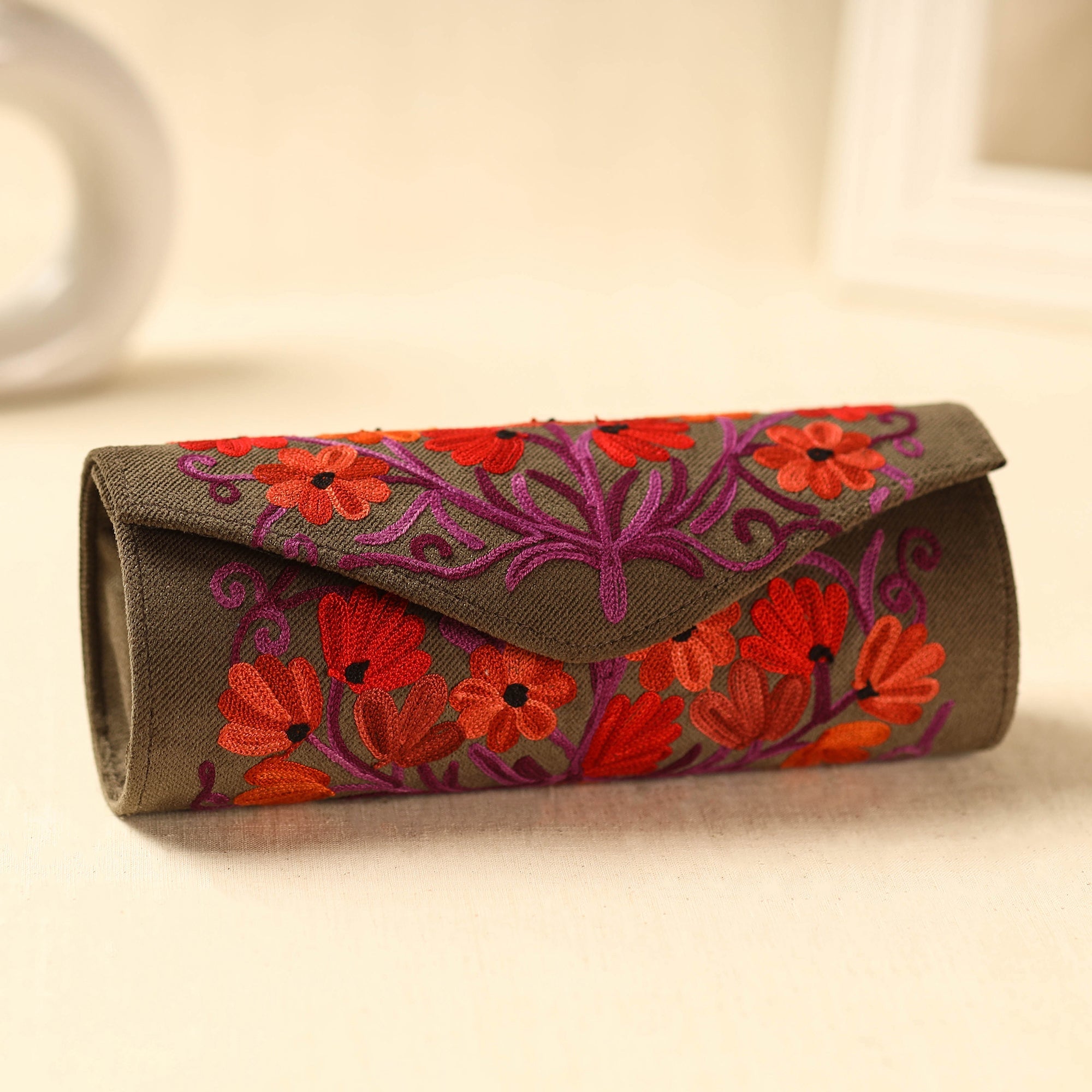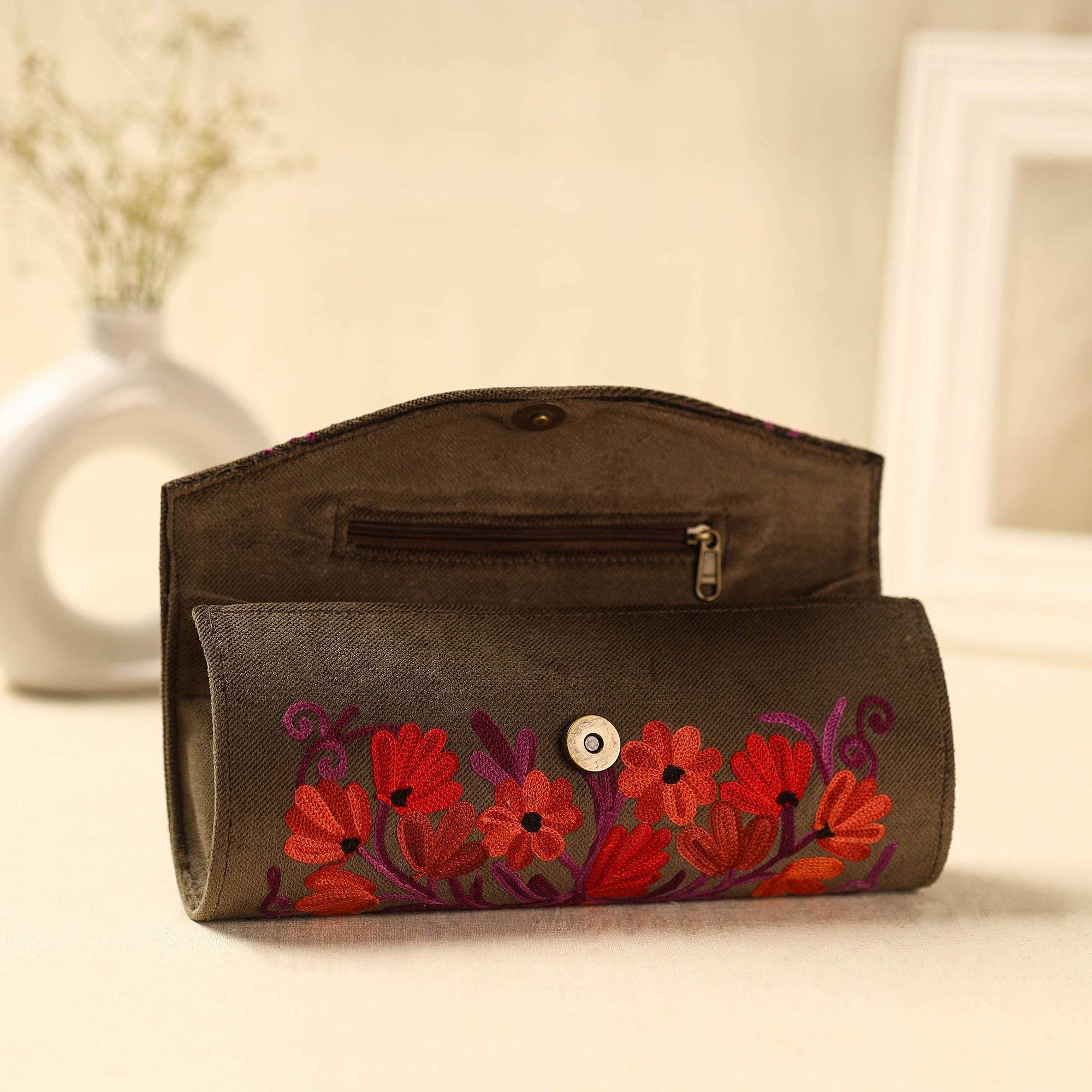 Organised your daily essentials with artisanal charm with our authentic brown kashmiri crewel hand embroidery velvet clutch/purse. This exquisite clutch purse showcases authentic kashmiri crewel embroidery, a thousand-year-old art form known for its intricate beauty. Made with rich wool & silk yarn on velvet, with an interior two zipper pocket it’s perfect for storing small essentials with a touch of elegance. Each piece supports skilled artisans in Kashmir, preserving cultural heritage through sustainable craftsmanship.