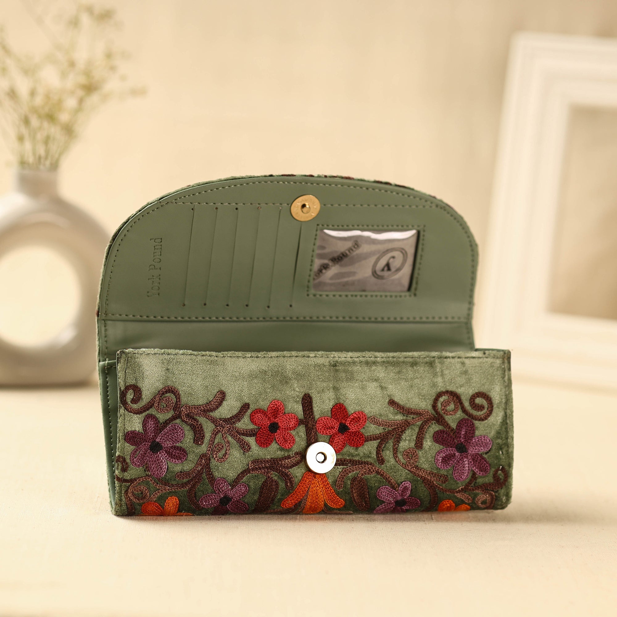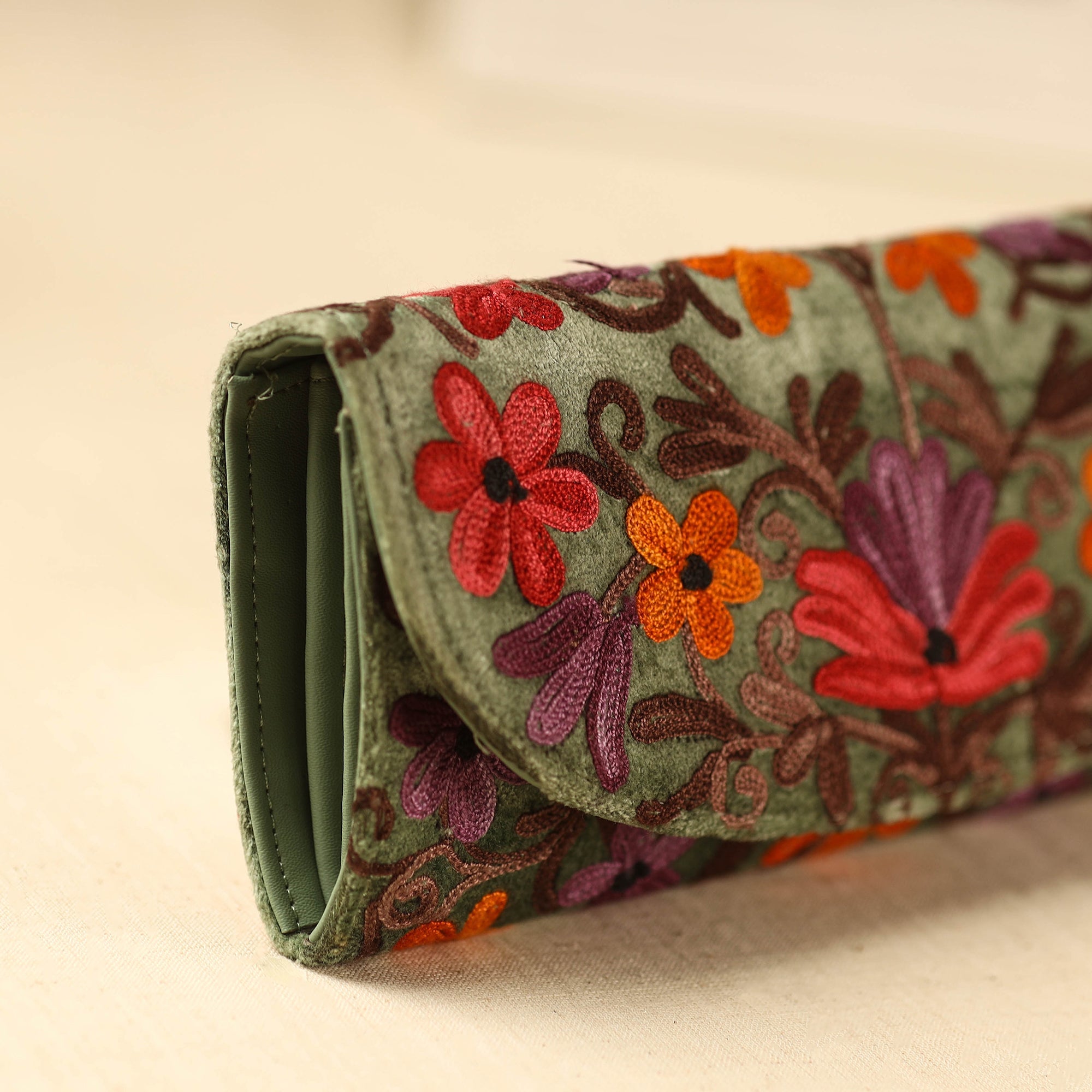 Organised your daily essentials with artisanal charm with our authentic green Kashmiri crewel hand embroidery velvet travel wallet. This exquisite wallet showcases authentic kashmiri crewel embroidery, a thousand-year-old art form known for its intricate beauty. Made from velvet & pure leather with rich wool & silk yarn on velvet. It has three sections for keeping documents, it also has interior two zipper pockets to keep money & coins, one exterior zipper pocket for easy eccess and six card slots for ATM, debit & credit cards. Each piece supports skilled artisans in Kashmir, preserving cultural heritage through sustainable craftsmanship.