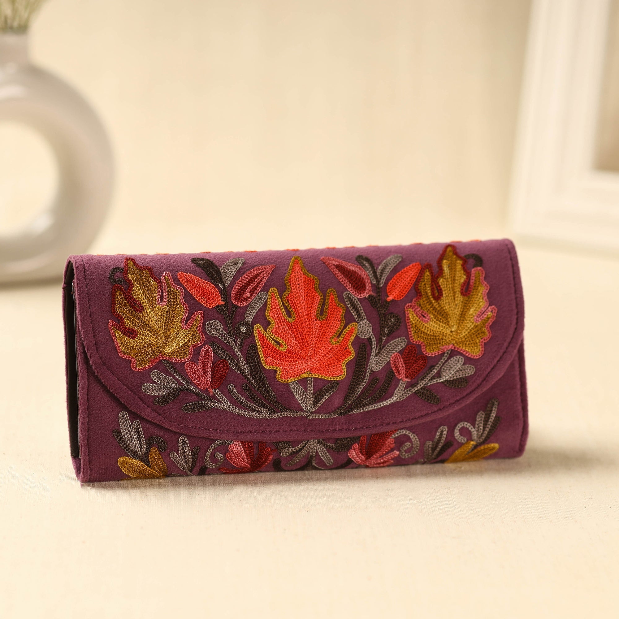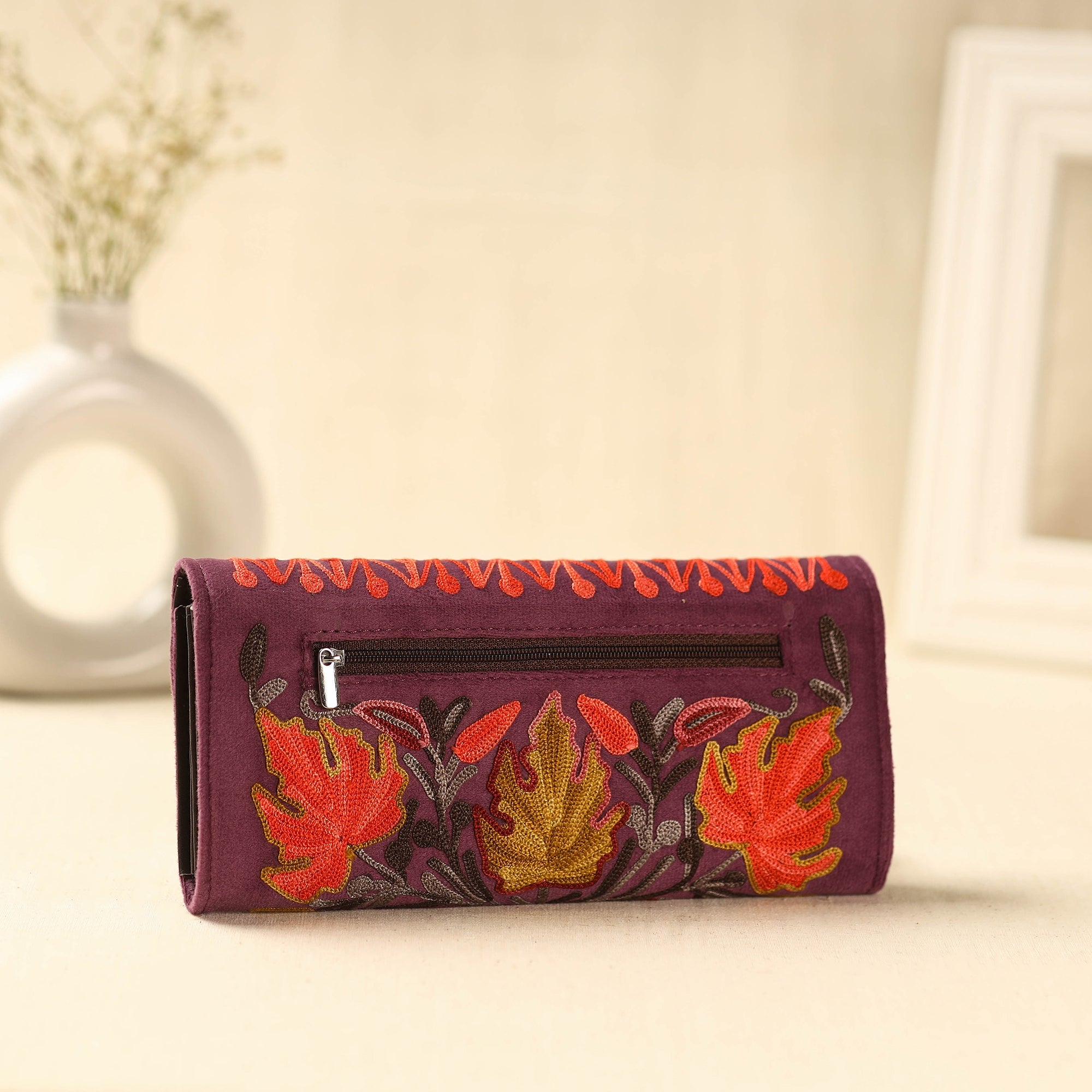 Organised your daily essentials with artisanal charm with our authentic purple Kashmiri crewel hand embroidery velvet travel wallet. This exquisite wallet showcases authentic kashmiri crewel embroidery, a thousand-year-old art form known for its intricate beauty. Made from velvet & pure leather with rich wool & silk yarn on velvet. It has three sections for keeping documents, it also has interior two zipper pockets to keep money & coins, one exterior zipper pocket for easy eccess and six card slots for ATM, debit & credit cards. Each piece supports skilled artisans in Kashmir, preserving cultural heritage through sustainable craftsmanship.
