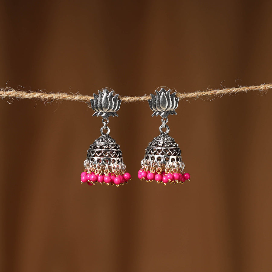 Elevate your look with these pink oxidised german silver jhumki earrings featuring intricate bead detailing. Crafted for elegance and strength, the alloy’s rustic sheen brings a timeless charm. A perfect pick for festive flair, everyday outings, or simply celebrating the beauty of handcrafted jewellery.
