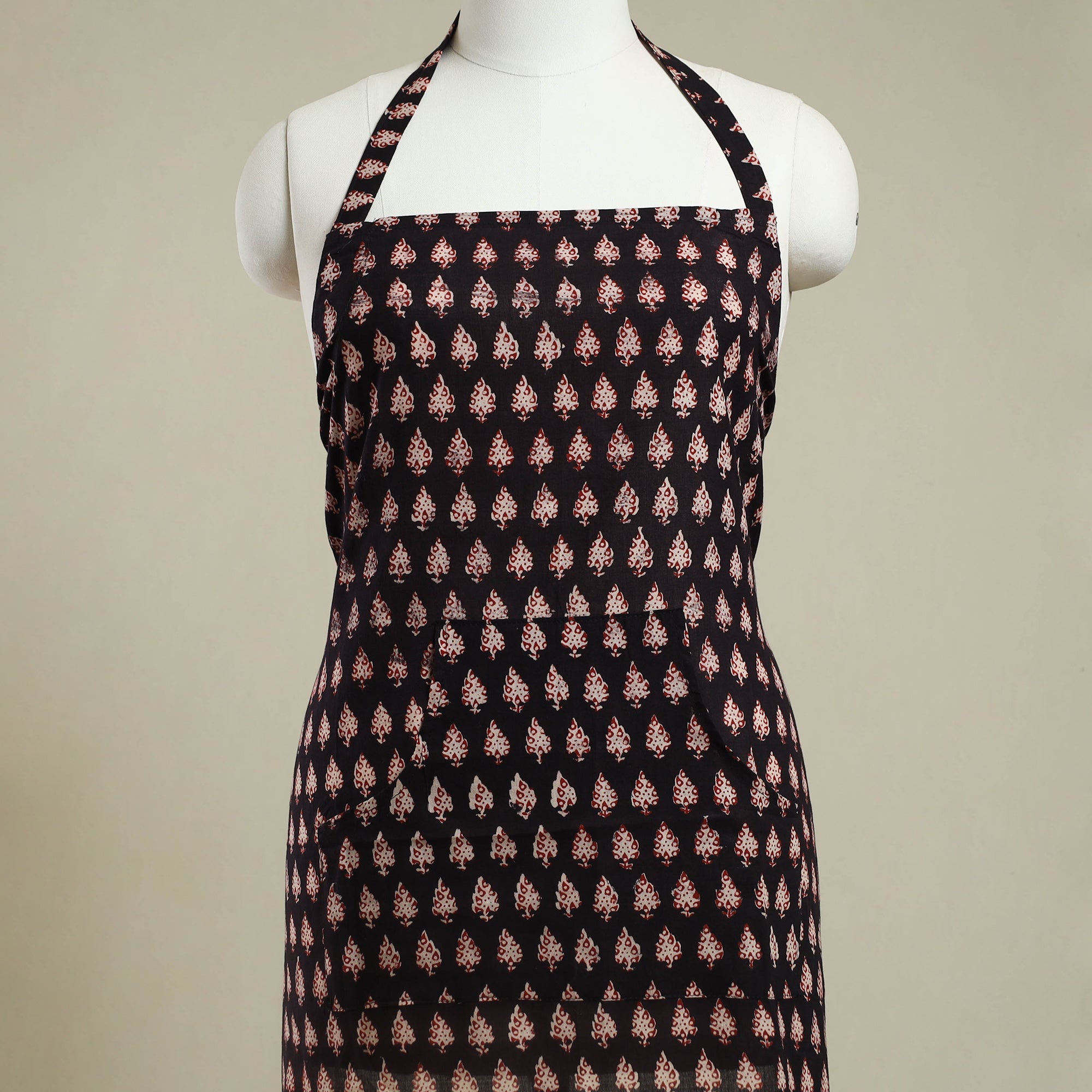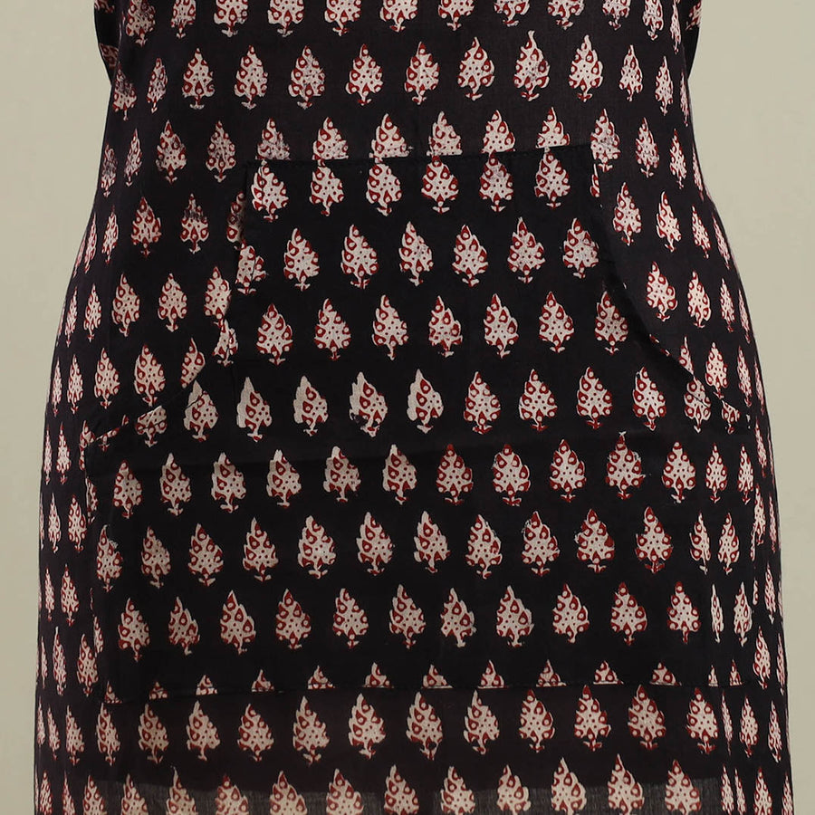 This black bagh block print cotton apron, created using traditional block printing techniques, features intricate patterns that bring a touch of heritage to your daily routine. Designed for both comfort and style, it includes adjustable straps for a personalized fit and a front pocket for added convenience. Whether you're cooking, baking, or grilling, this apron offers ease of movement while keeping you stylish.