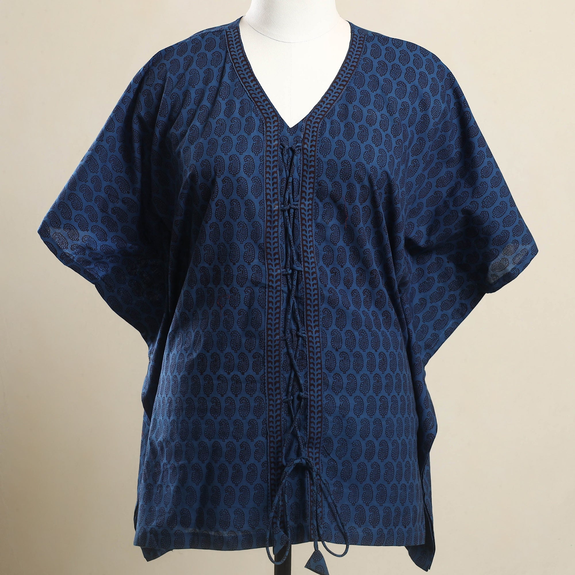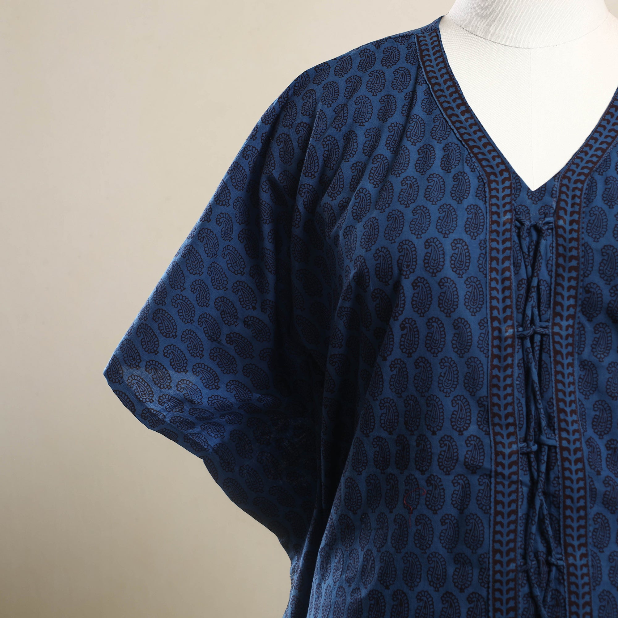 Experience the beauty of Indian craftsmanship with this blue bagh block print cotton kaftan, designed for effortless elegance and comfort. Made from breathable cotton, it features the traditional bagh block print. The kaftan drapes gracefully with its relaxed fit, while the adjustable drawstring waist allows for a custom fit perfect for lounging, vacations, or casual day outs.