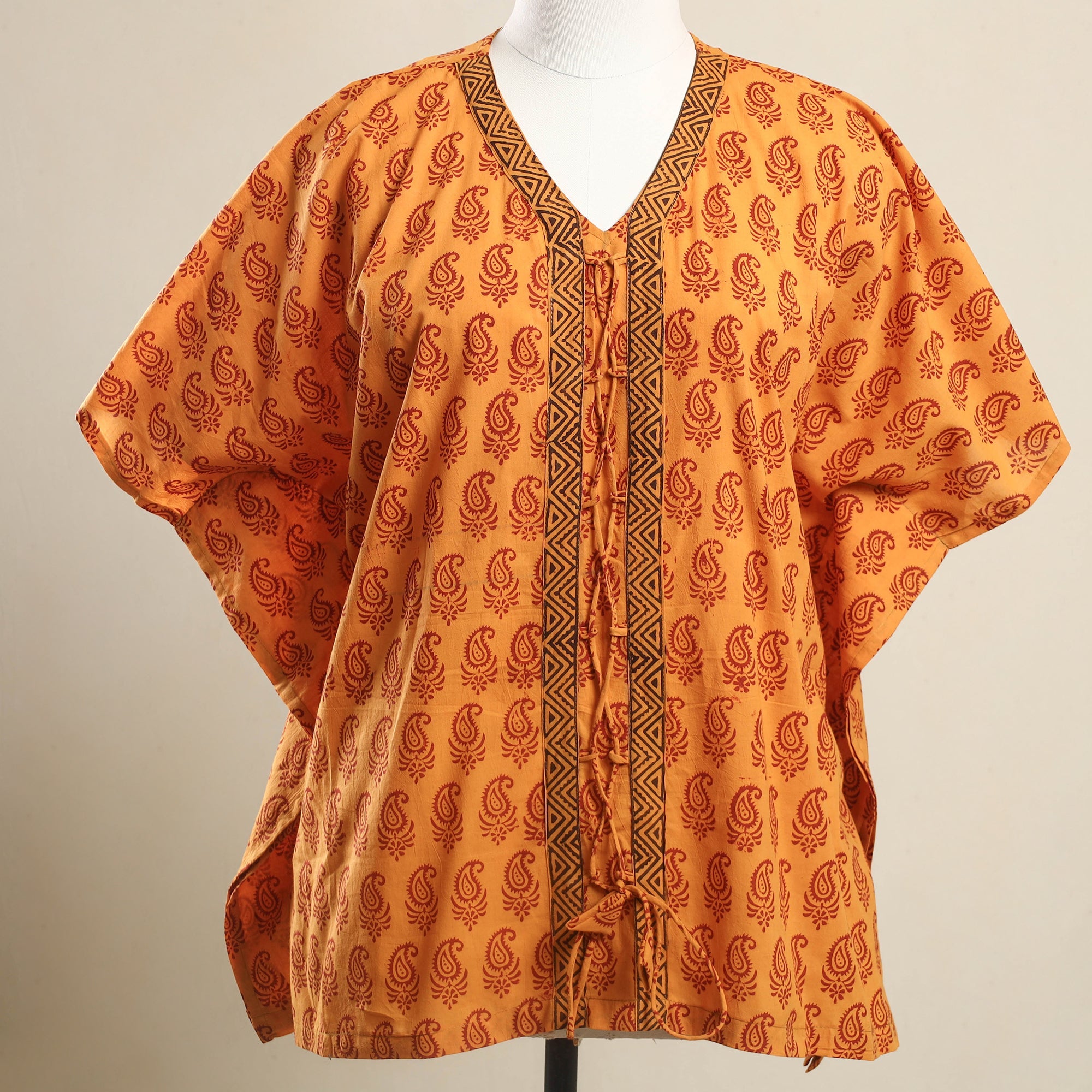 Experience the beauty of Indian craftsmanship with this orange bagh block print cotton kaftan, designed for effortless elegance and comfort. Made from breathable cotton, it features the traditional bagh block print. The kaftan drapes gracefully with its relaxed fit, while the adjustable drawstring waist allows for a custom fit perfect for lounging, vacations, or casual day outs.