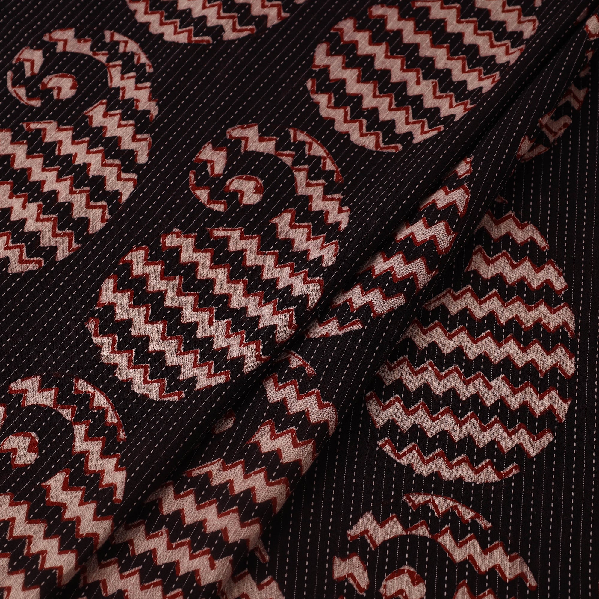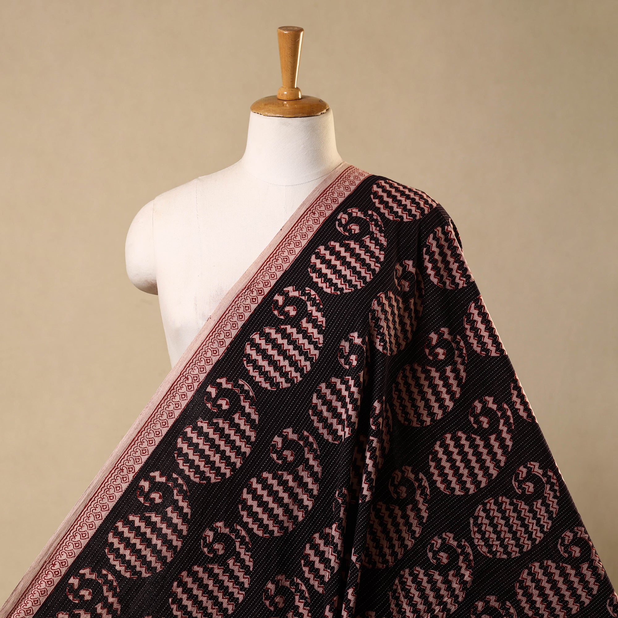 This black bagh print fabric is hand block printed by master artisan Umar Faruk Khatri from Bagh, Madhya Pradesh. Crafted using natural dyes and traditional techniques, it features Kantha- stitch detailing printed on cotton. Ideal for garments, accessories, or home décor, this heritage-inspired textile combines traditional aesthetics with everyday usability.