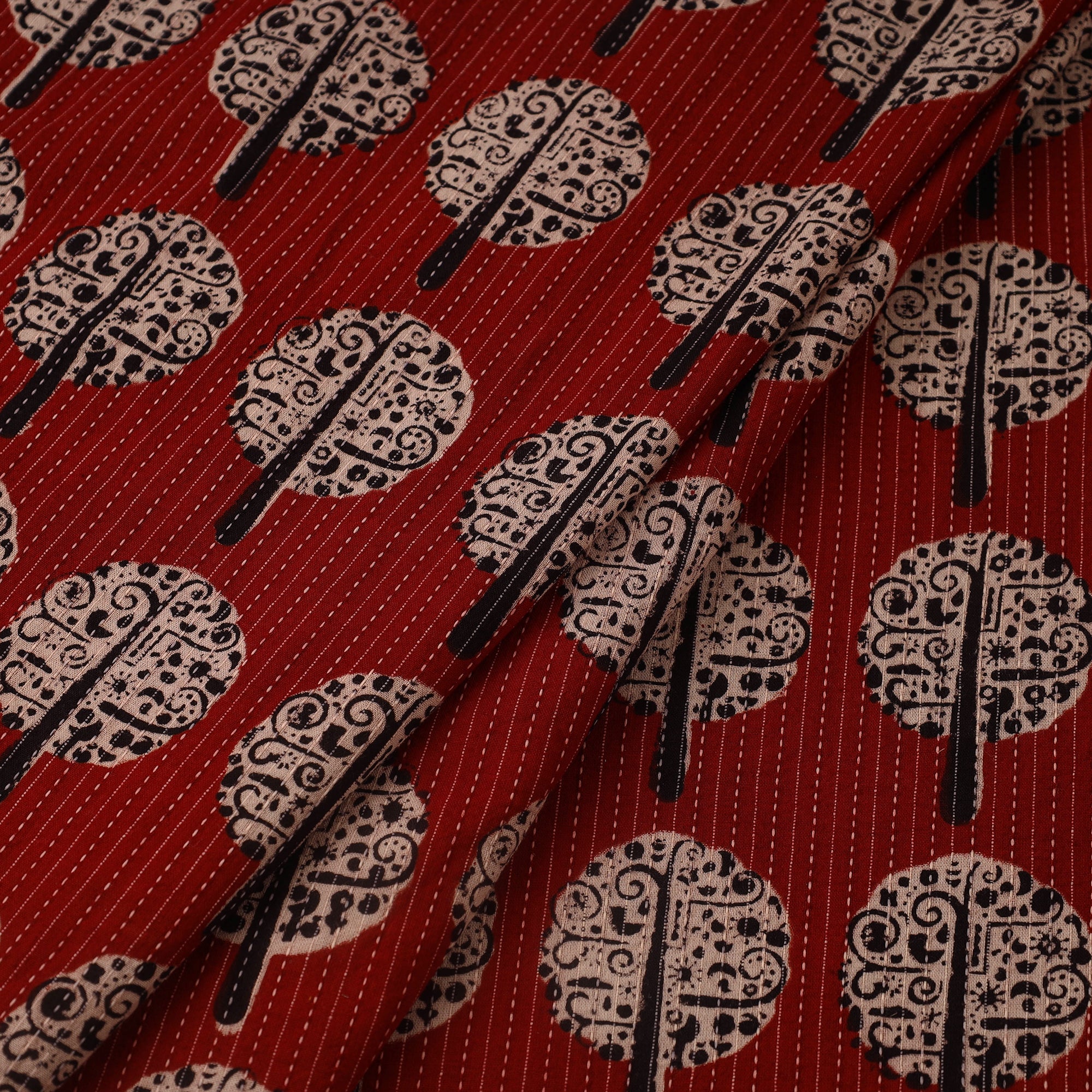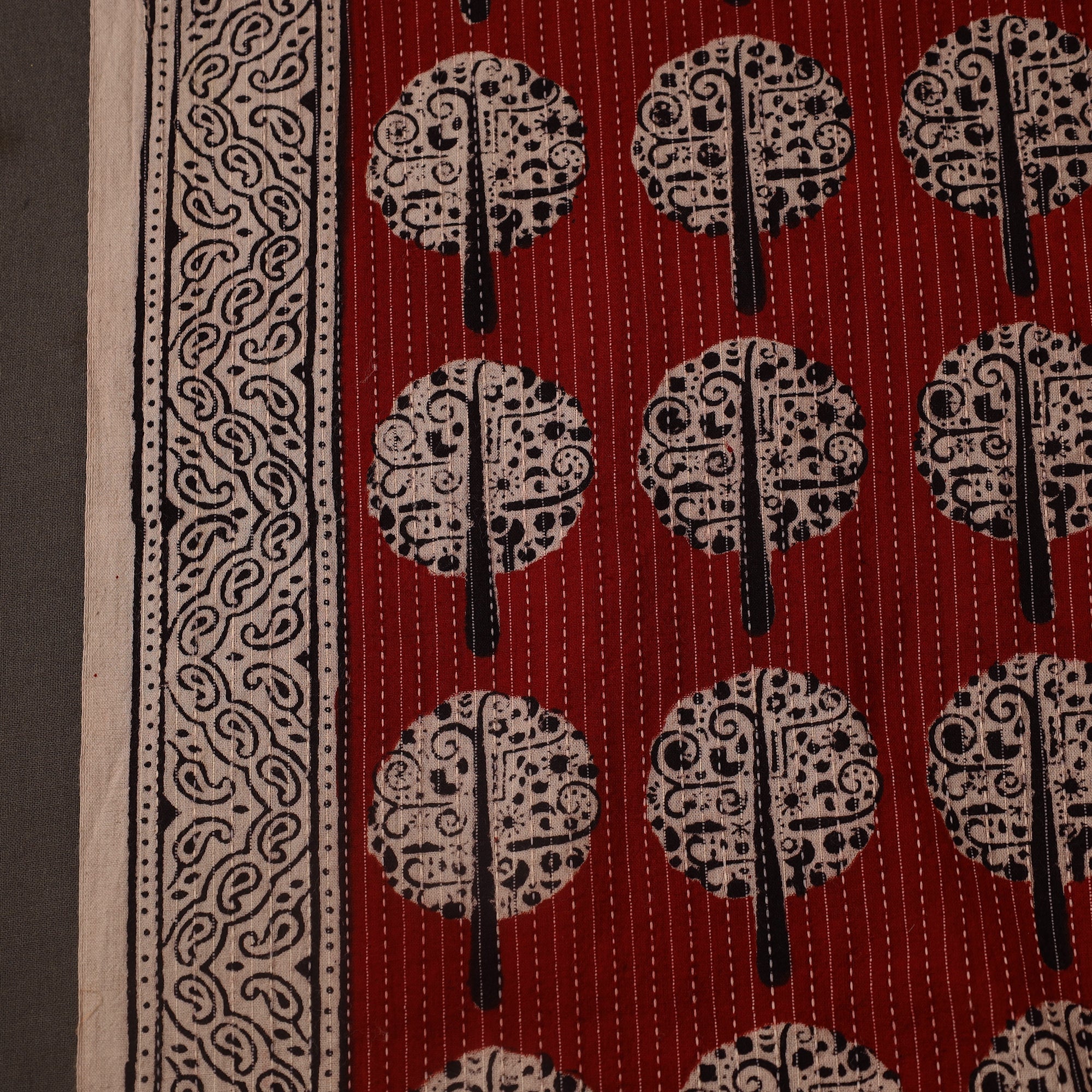 This maroon bagh print fabric is hand block printed by master artisan Umar Faruk Khatri from Bagh, Madhya Pradesh. Crafted using natural dyes and traditional techniques, it features Kantha- stitch detailing printed on cotton. Ideal for garments, accessories, or home décor, this heritage-inspired textile combines traditional aesthetics with everyday usability.