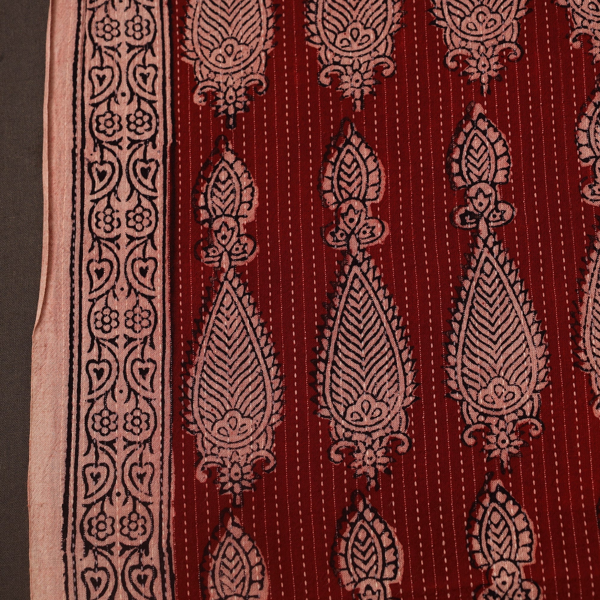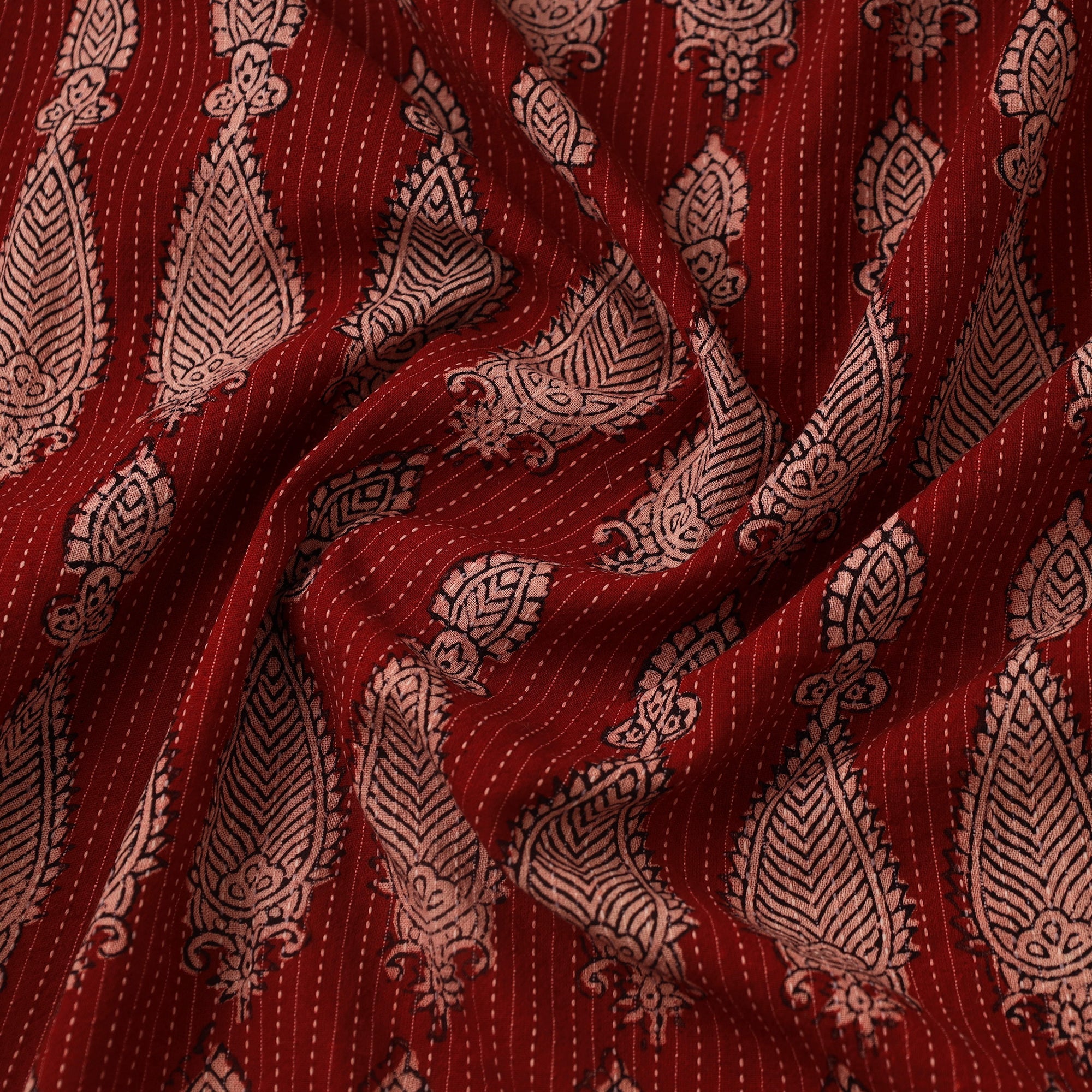 This red bagh print fabric is hand block printed by master artisan Umar Faruk Khatri from Bagh, Madhya Pradesh. Crafted using natural dyes and traditional techniques, it features Kantha- stitch detailing printed on cotton. Ideal for garments, accessories, or home décor, this heritage-inspired textile combines traditional aesthetics with everyday usability.