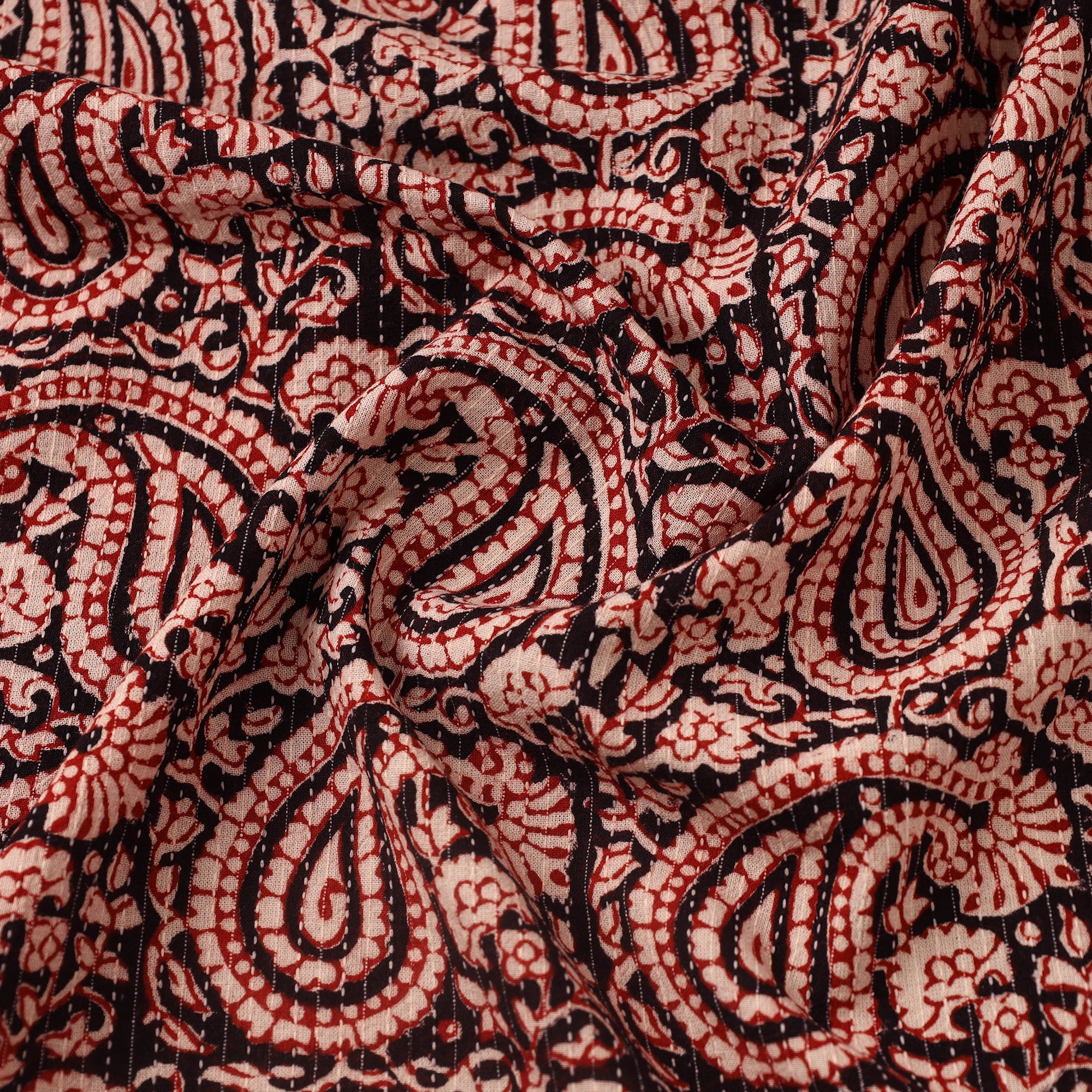 This red bagh print fabric is hand block printed by master artisan Umar Faruk Khatri from Bagh, Madhya Pradesh. Crafted using natural dyes and traditional techniques, it features Kantha- stitch detailing printed on cotton. Ideal for garments, accessories, or home décor, this heritage-inspired textile combines traditional aesthetics with everyday usability.