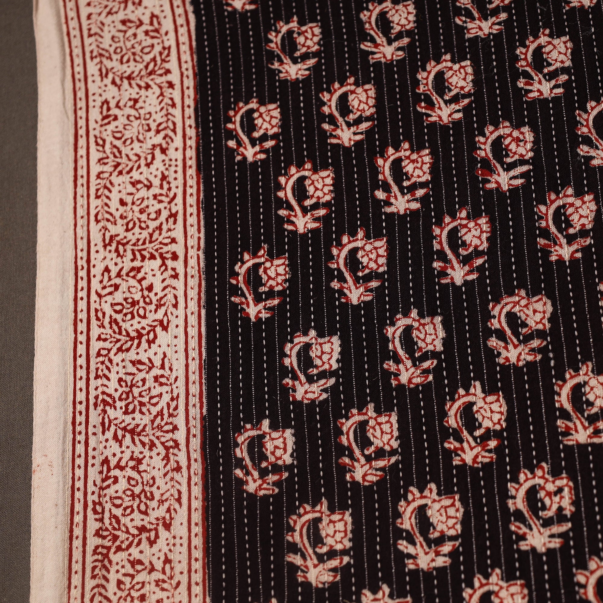 This black bagh print fabric is hand block printed by master artisan Umar Faruk Khatri from Bagh, Madhya Pradesh. Crafted using natural dyes and traditional techniques, it features Kantha- stitch detailing printed on cotton. Ideal for garments, accessories, or home décor, this heritage-inspired textile combines traditional aesthetics with everyday usability.