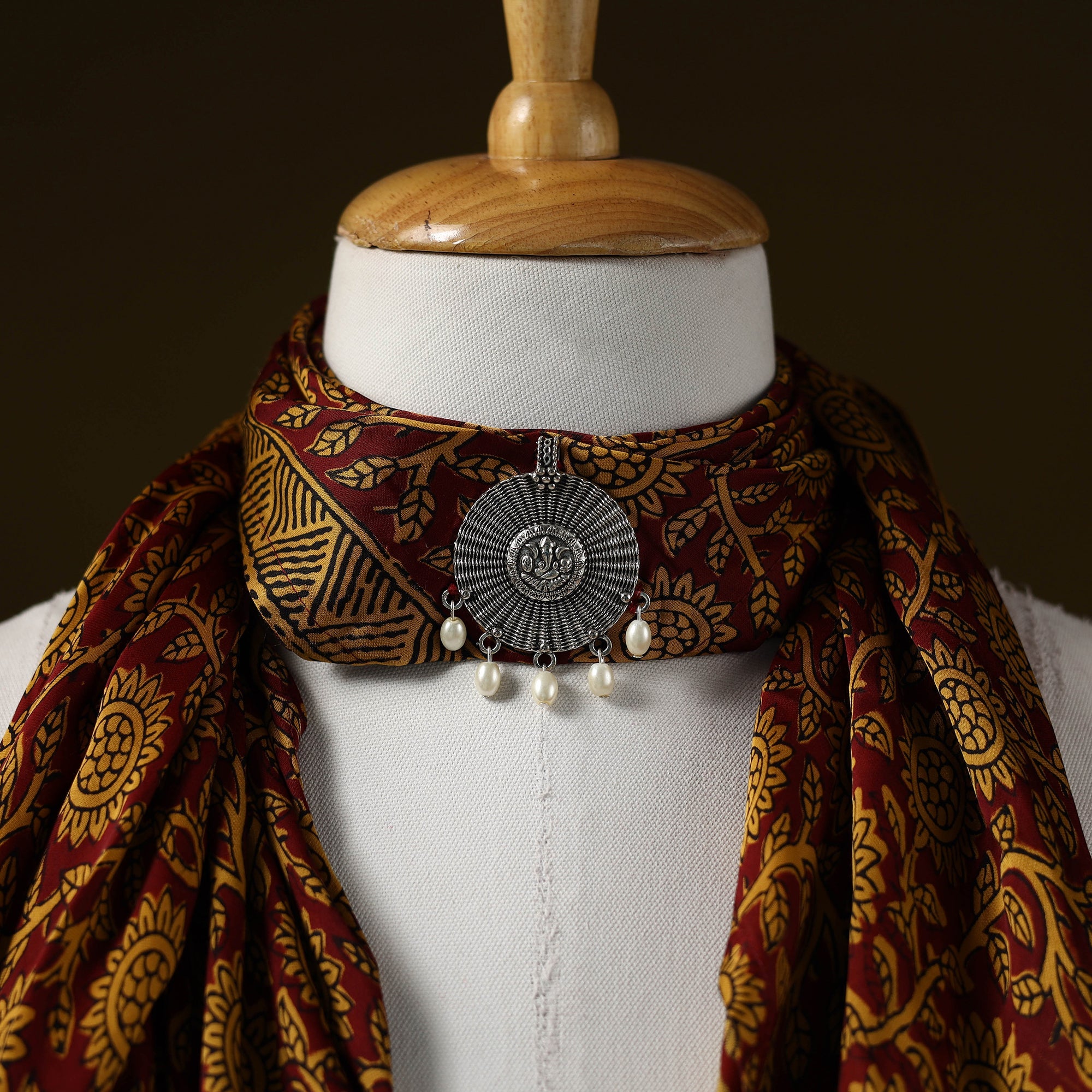 Bagh hand block print german silver pendant necklace scarf is a versatile accessory designed for effortless styling. Soft and comfortable to wear, it features detailed block-printed motifs that add a distinctive touch. You can style it as a choker or wear it as a pendant to create different looks. Made using modal silk, the scarf offers a balanced feel with a subtle sheen and a comfortable drape, making it suitable for everyday as well as occasion wear.