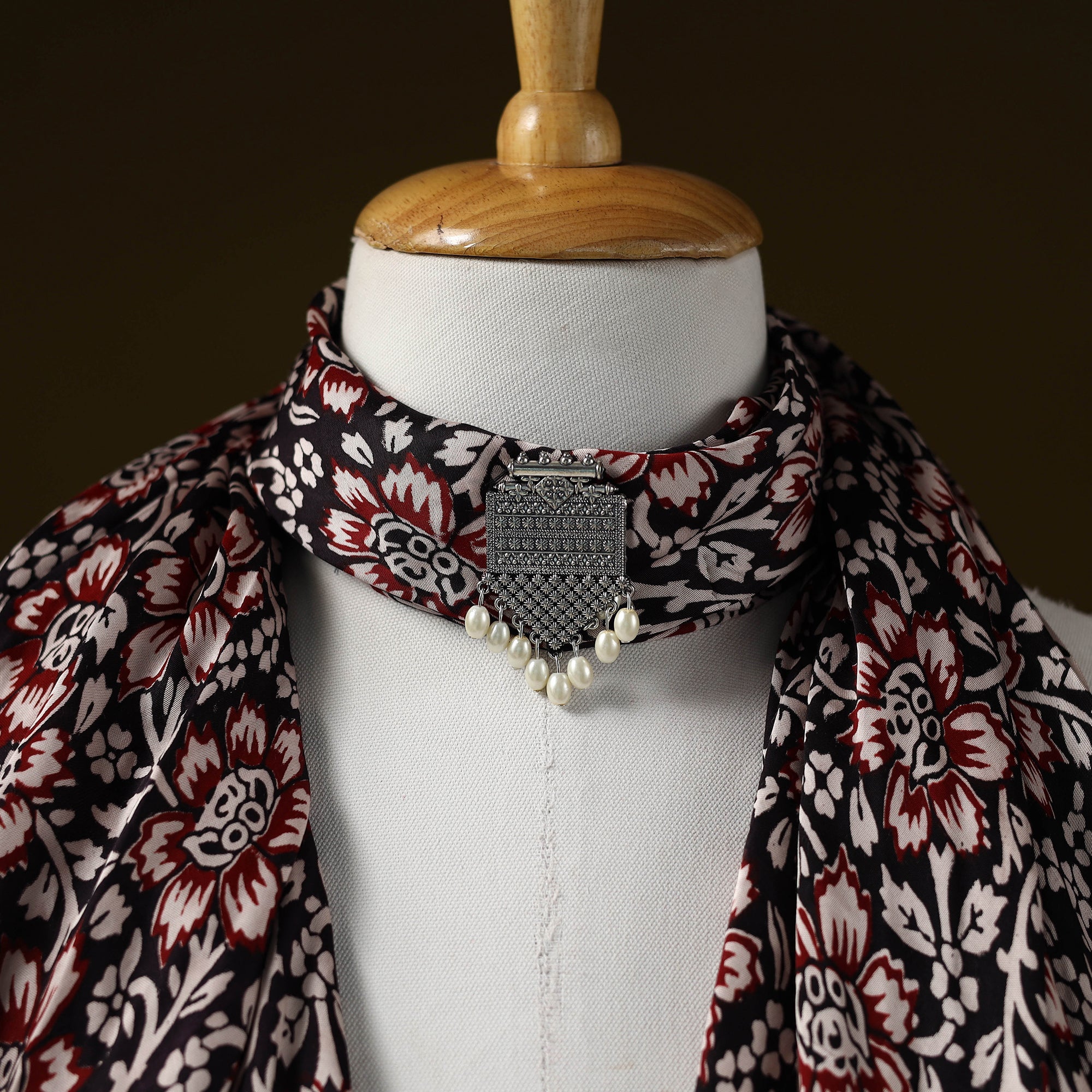 Bagh hand block print german silver pendant necklace scarf is a versatile accessory designed for effortless styling. Soft and comfortable to wear, it features detailed block-printed motifs that add a distinctive touch. You can style it as a choker or wear it as a pendant to create different looks. Made using modal silk, the scarf offers a balanced feel with a subtle sheen and a comfortable drape, making it suitable for everyday as well as occasion wear.