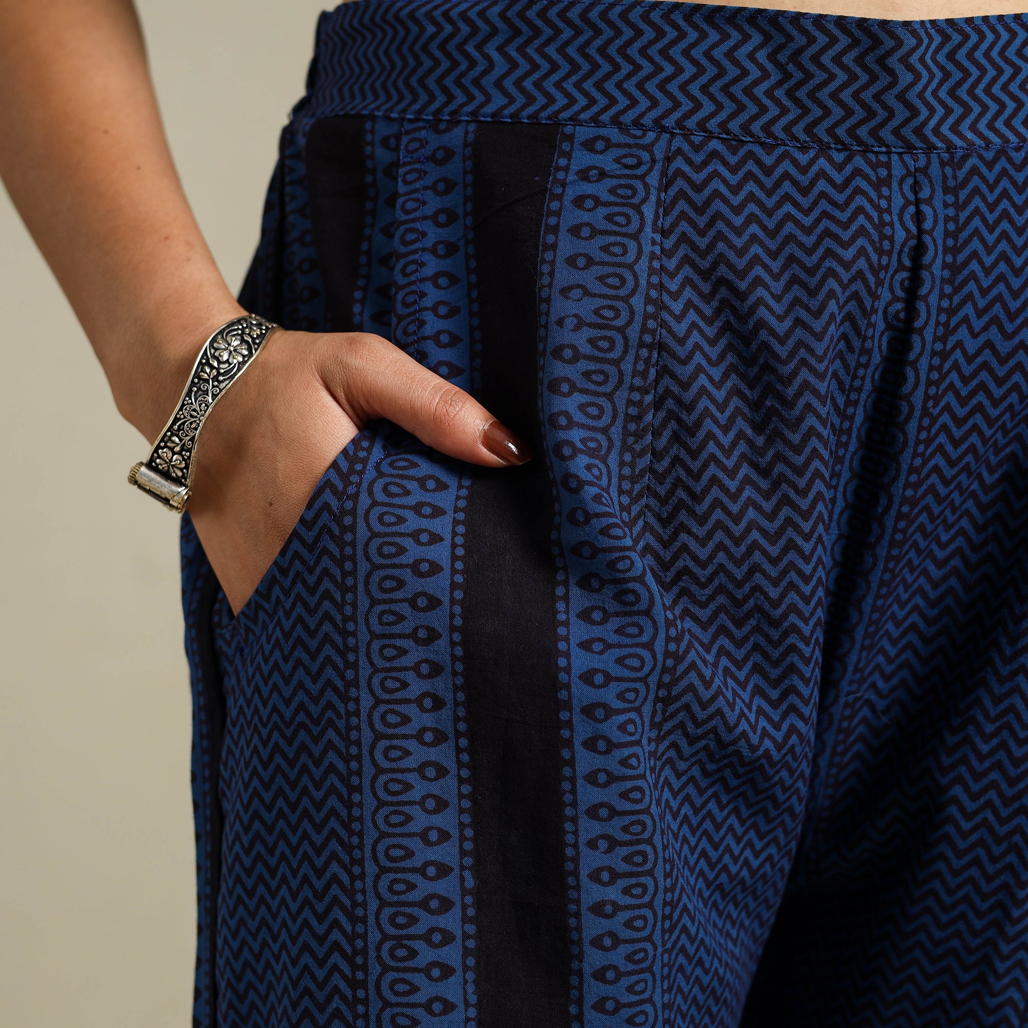 This soft cotton blue palazzo is designed for all-day comfort, featuring an easy elasticated waist and practical side pockets. Hand block printed by skilled artisans using the traditional bagh technique from Madhya Pradesh, it is coloured with natural dyes that are safe for the skin. Light, breathable, and stylish, it’s perfect for daily wear, office looks, casual outings, or festive pairings.