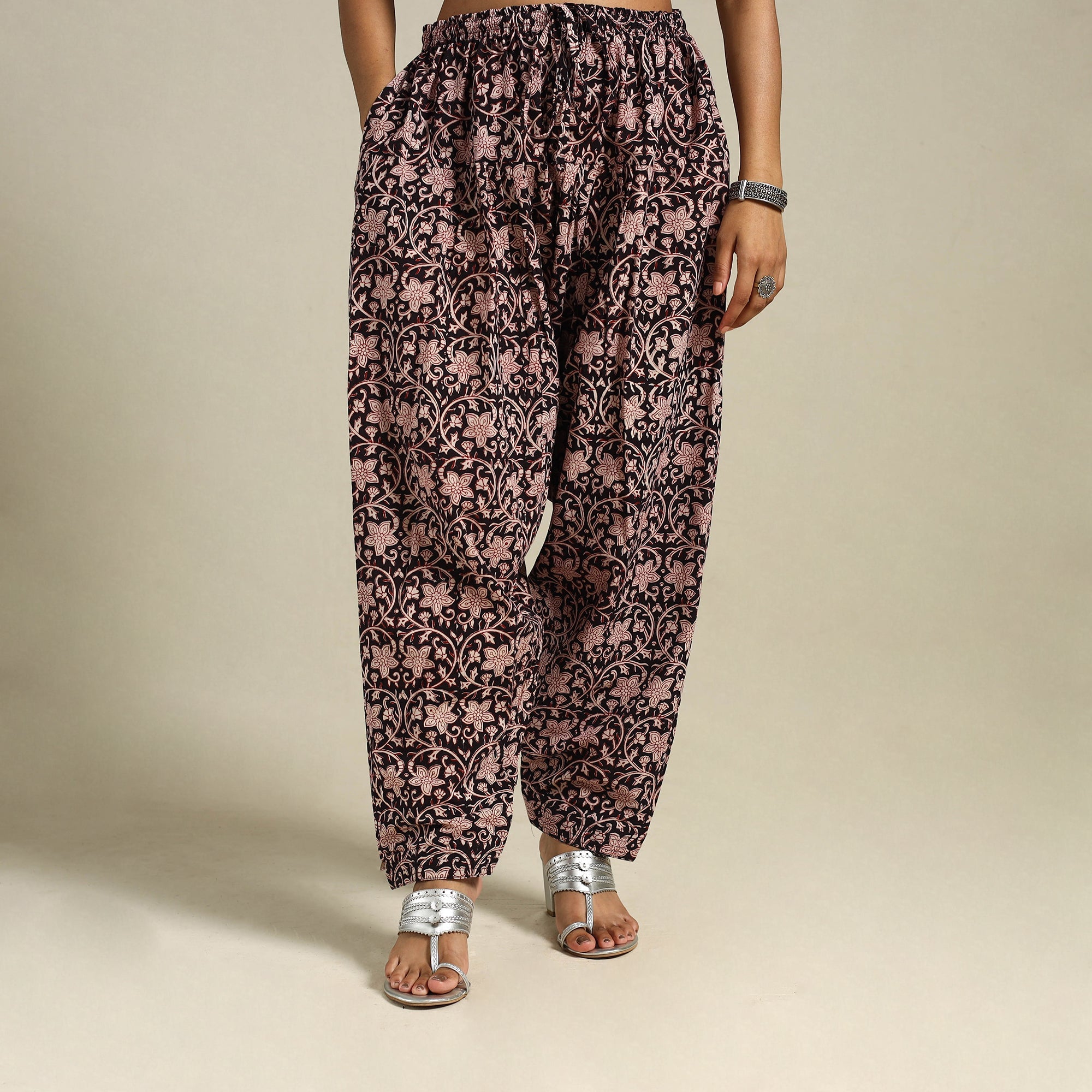 Celebrate the charm of bagh block printing with this black cotton salwar from Madhya Pradesh. Made using traditional natural dye techniques, it features an elasticated waistband, a side pocket, and a drawstring for enhanced comfort. Whether teamed with a kurta or worn as a casual staple, it’s an elegant and effortless pick.