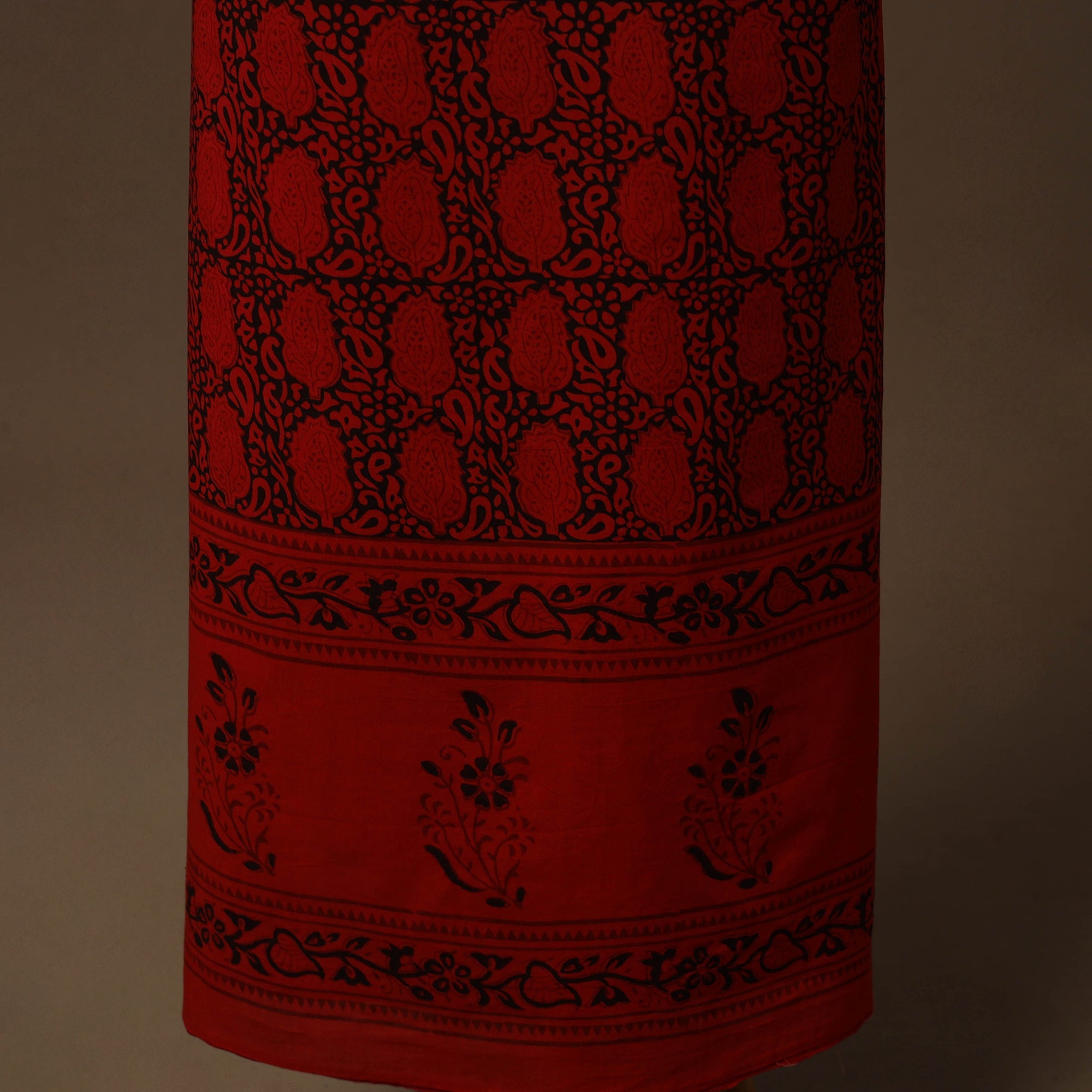 Bagh layouts are dramatic with the use of black and red alternately on a white background. Its production process is manually painstaking. Though the techniques and designs are age-old the prints retain their contemporary appeal.