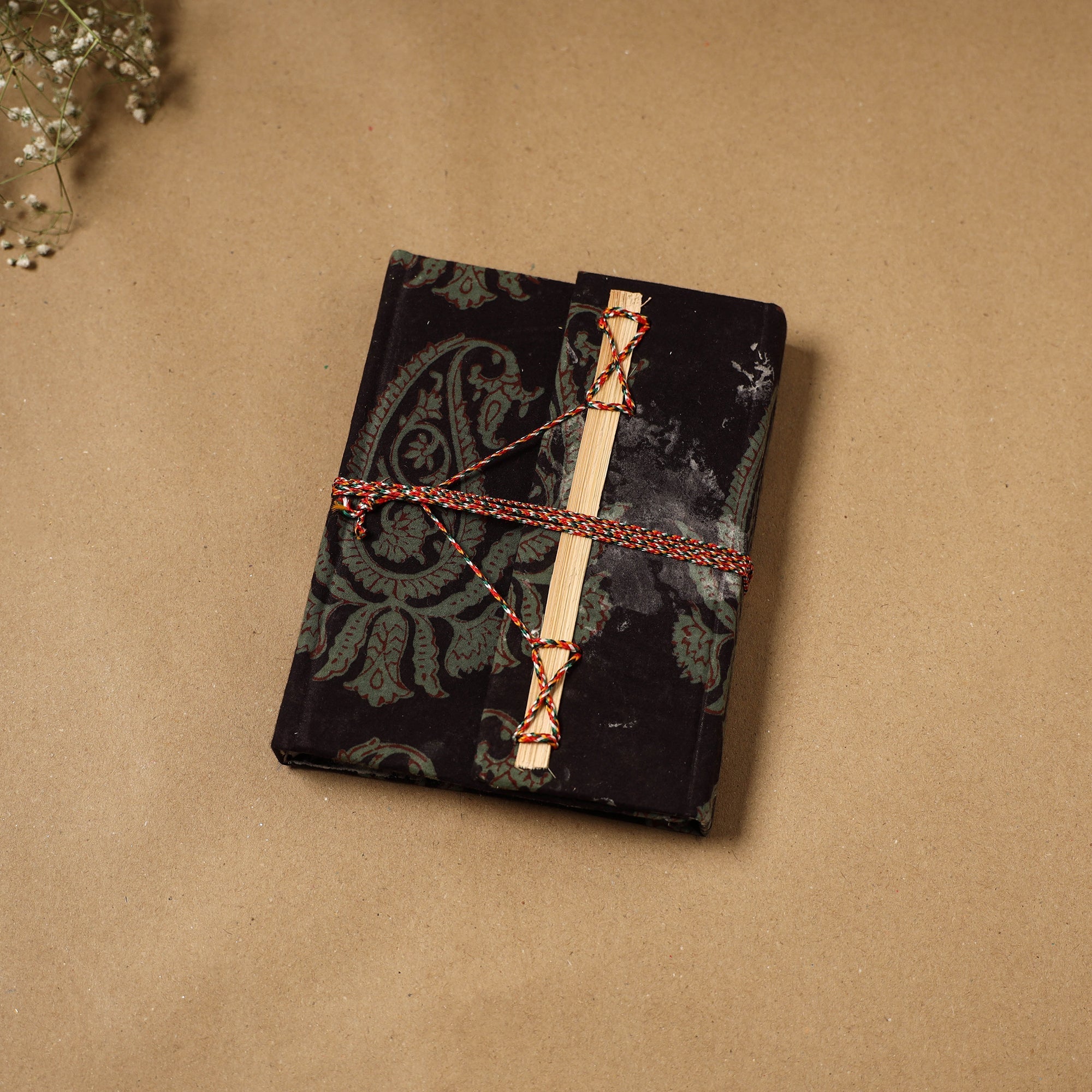 | Material | Black bagh block printed fabric-embellished hardbound cover notebook with a thread-lock closure and handmade papers. The paper is made from cotton and other natural fibre waste, recycled in an eco-friendly process without the use of chemicals. Crafted by skilled artisans who give careful personal attention to every detail. A creative and practical choice for journaling, planning or capturing daily thoughts. |