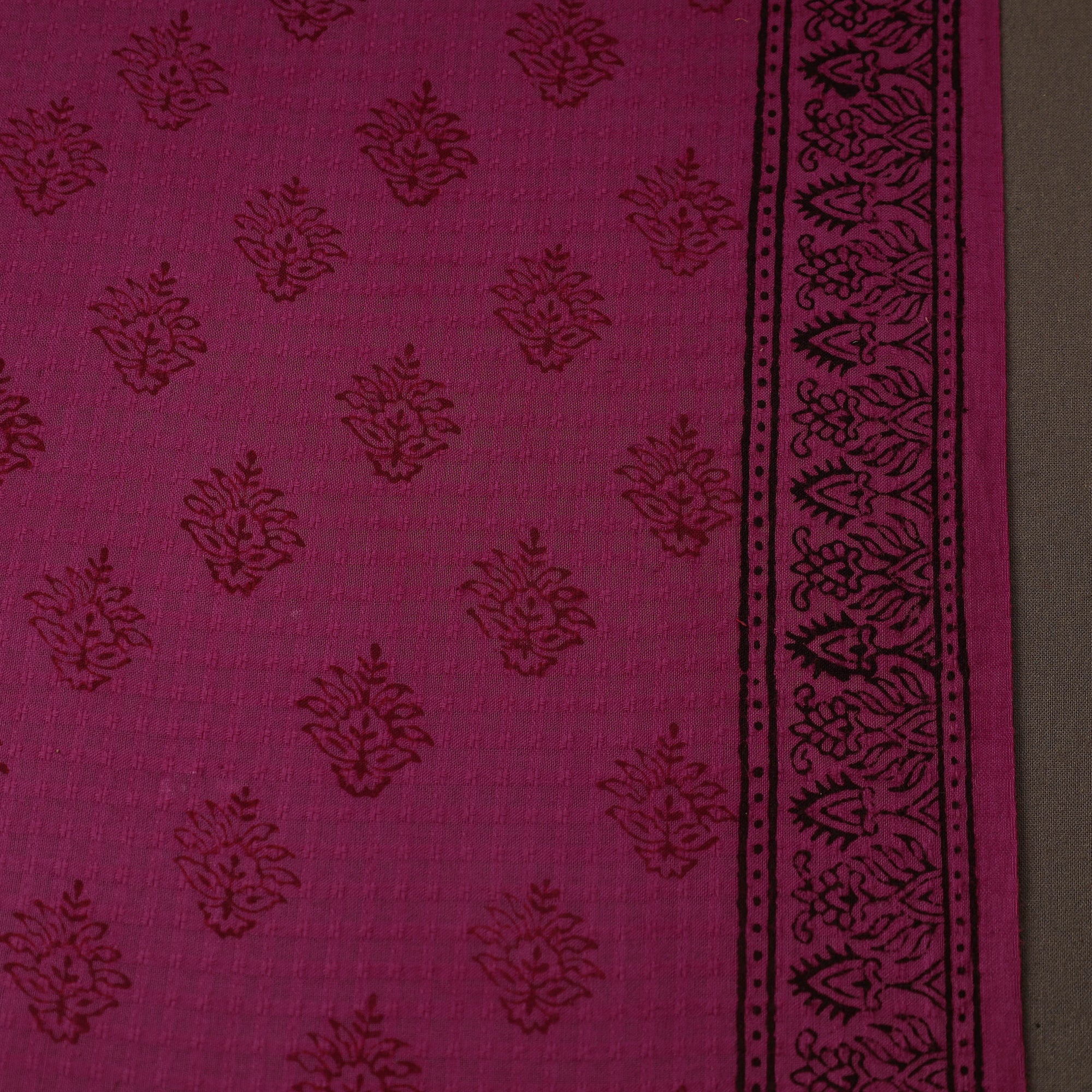 This purple bagh hand block print fabric is created by master artisan Umar Faruk Khatri from Bagh, Madhya Pradesh. Made using natural dyes on striped cotton, it features traditional geometric motifs that add a unique charm. Ideal for making kurtas, dresses, or home decor.
