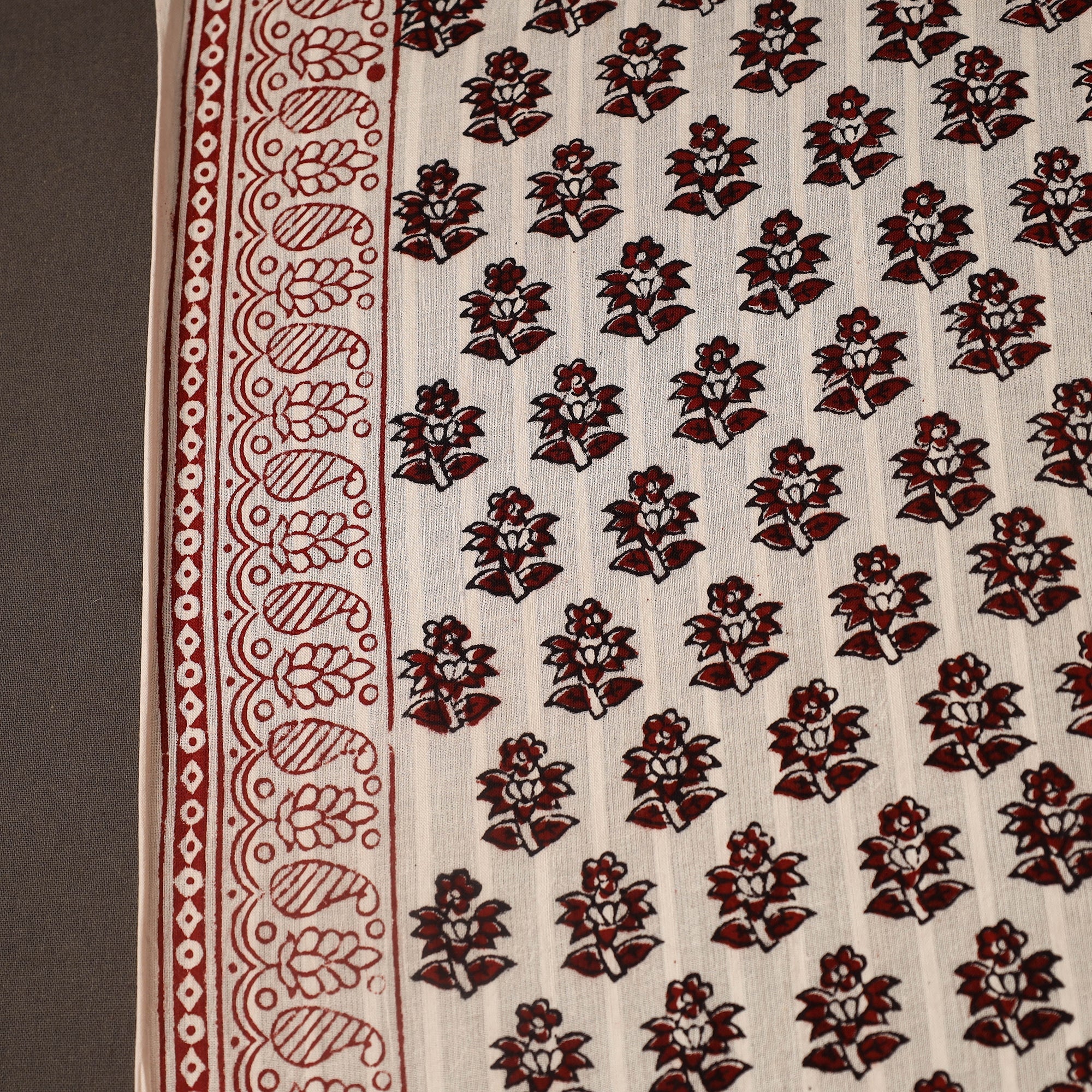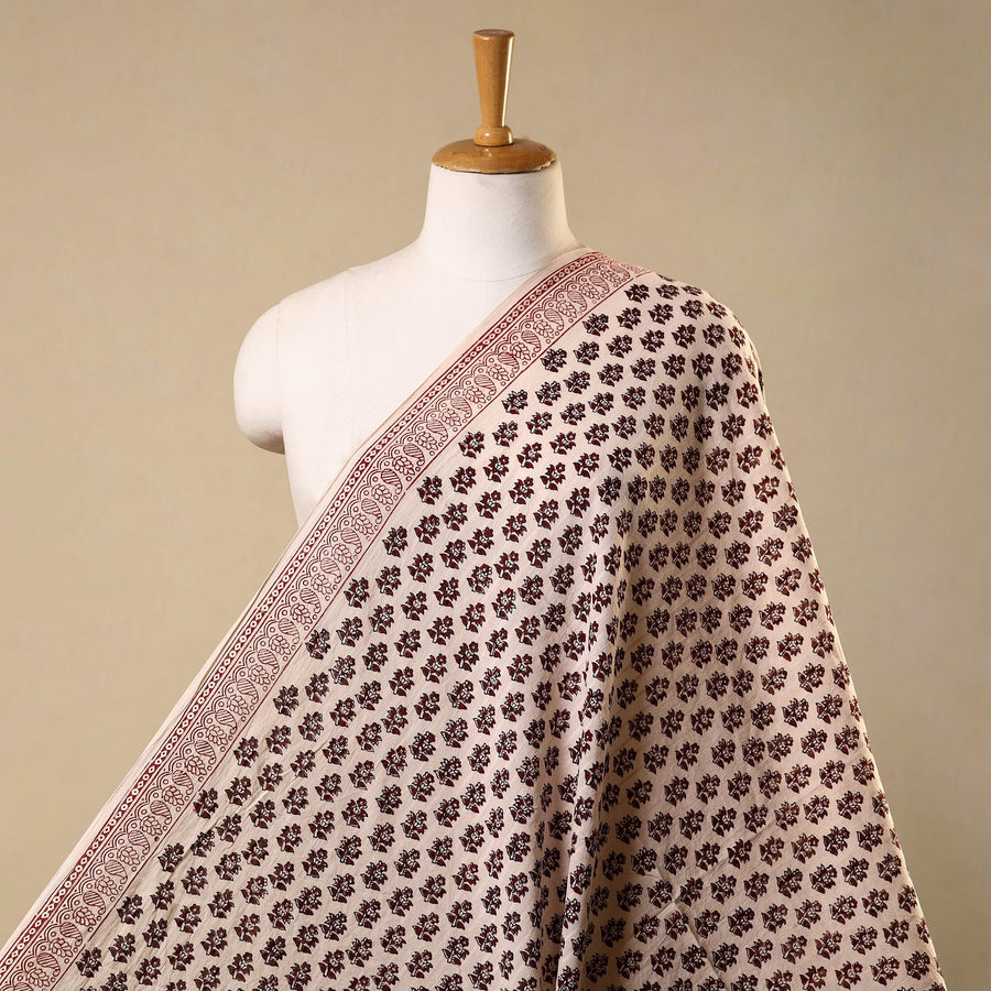 This beige bagh hand block print fabric is created by master artisan Umar Faruk Khatri from Bagh, Madhya Pradesh. Made using natural dyes on striped cotton, it features traditional geometric motifs that add a unique charm. Ideal for making kurtas, dresses, or home decor.