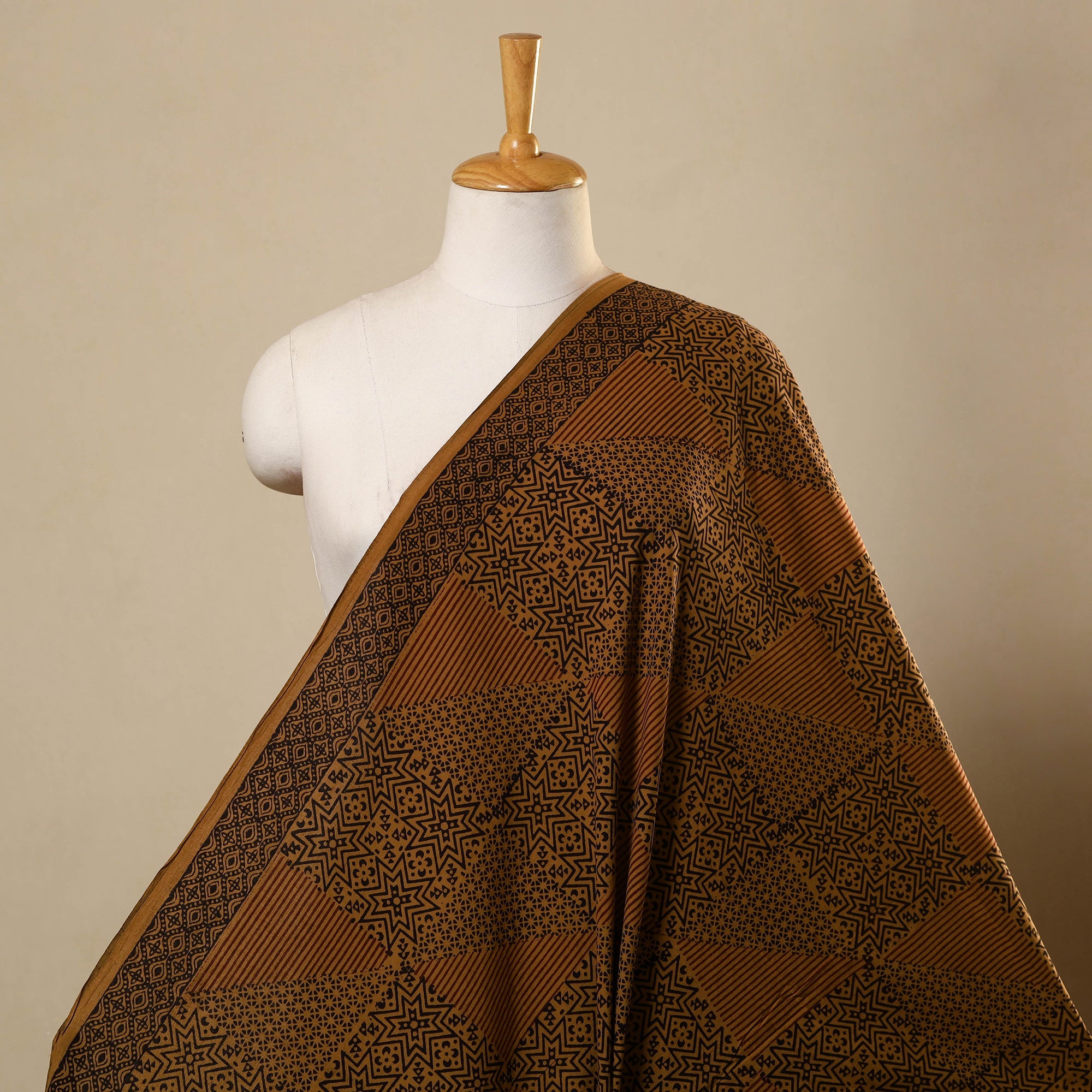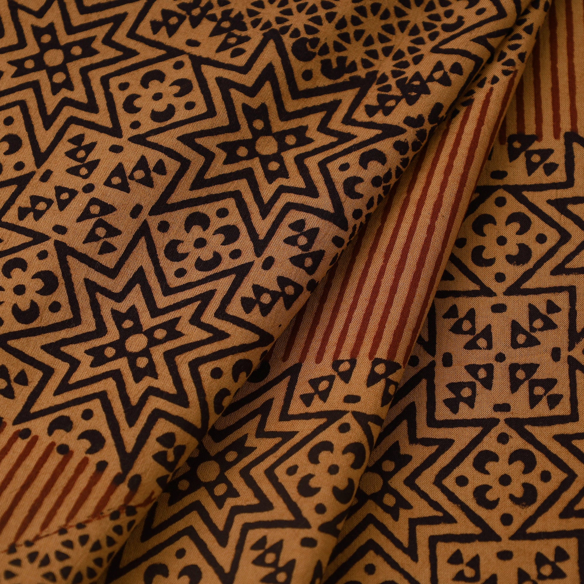 This brown bagh print fabric is hand block printed by master artisan Umar Faruq Khatri from Bagh, Madhya Pradesh. Crafted using natural dyes and traditional techniques, it features geometric motifs on cotton. Ideal for garments, accessories, or home décor, this fabric reflects the essence of heritage with everyday usability.