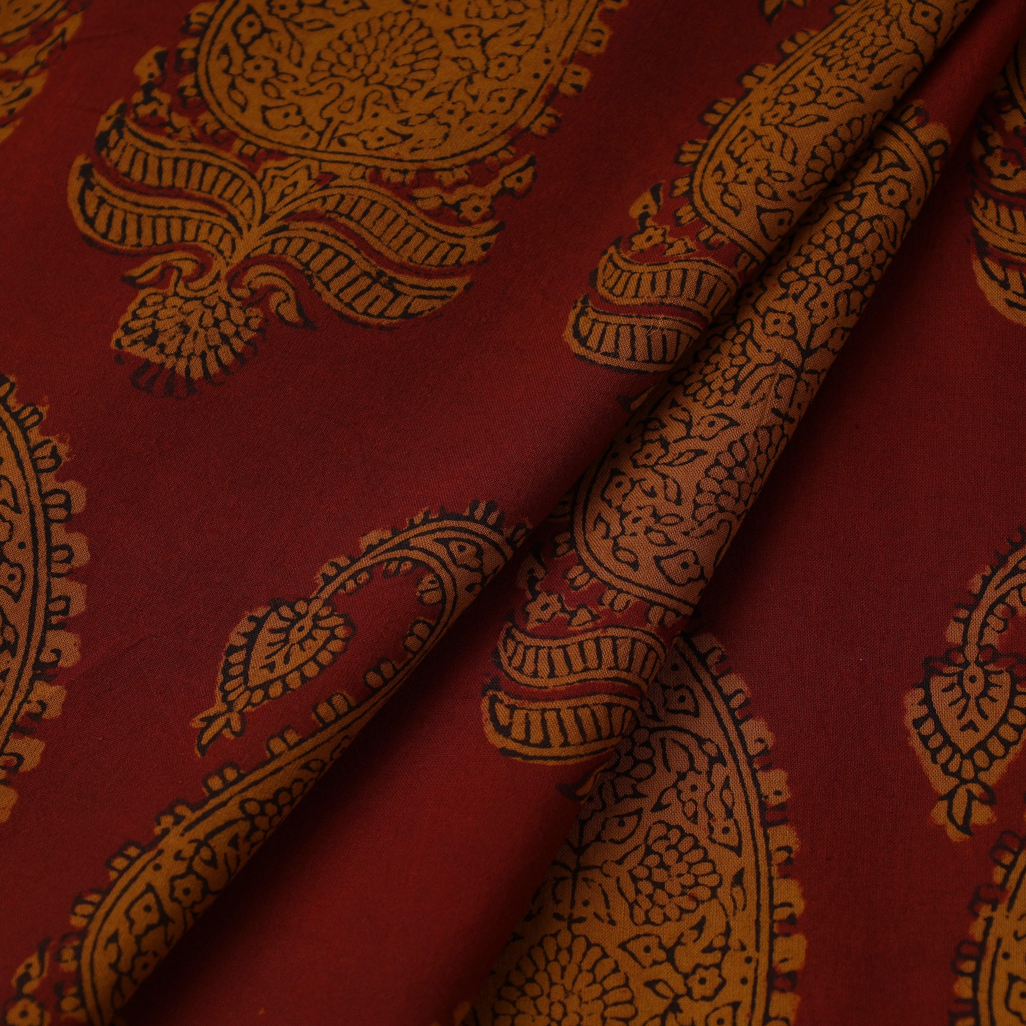 This maroon bagh print fabric is hand block printed by master artisan Umar Faruq Khatri from Bagh, Madhya Pradesh. Crafted using natural dyes and traditional techniques, it features geometric motifs on cotton. Ideal for garments, accessories, or home décor, this fabric reflects the essence of heritage with everyday usability.