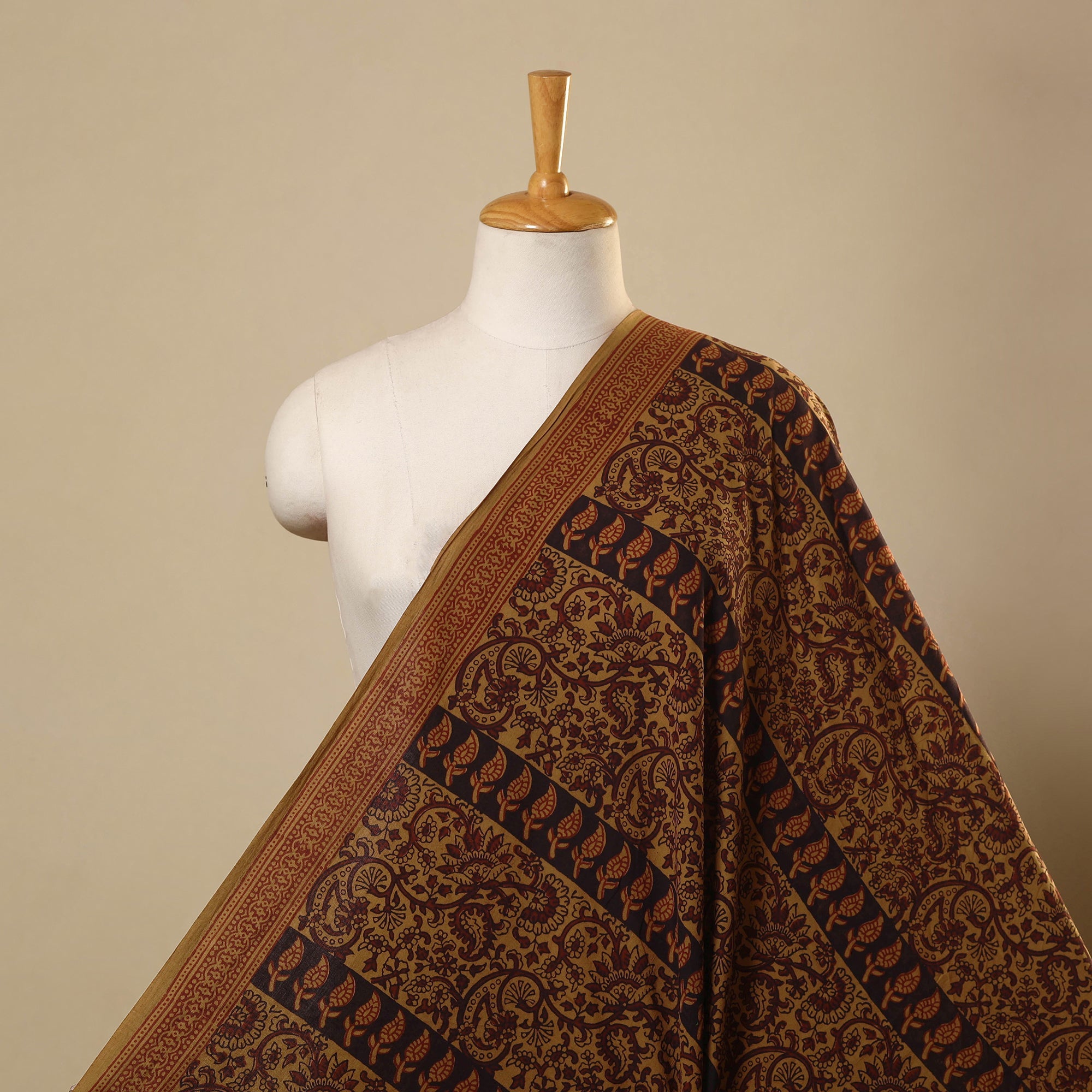 This brown bagh print fabric is hand block printed by master artisan Umar Faruq Khatri from Bagh, Madhya Pradesh. Crafted using natural dyes and traditional techniques, it features geometric motifs on cotton. Ideal for garments, accessories, or home décor, this fabric reflects the essence of heritage with everyday usability.