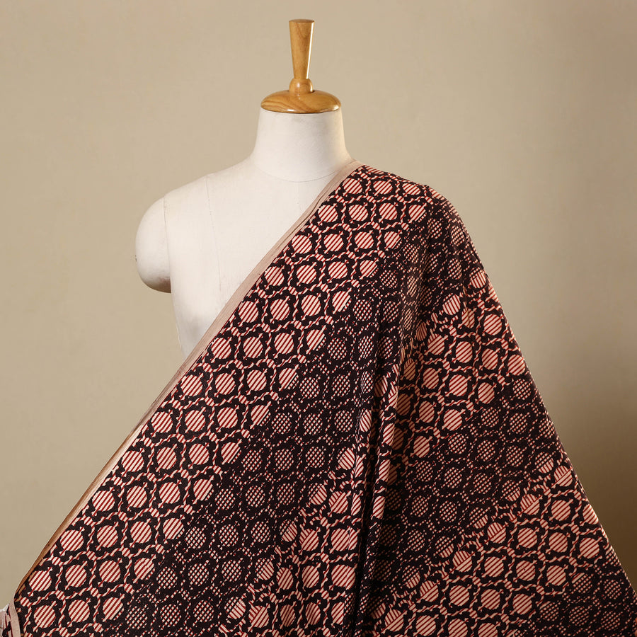 This black bagh print fabric is hand block printed by master artisan Umar Faruq Khatri from Bagh, Madhya Pradesh. Crafted using natural dyes and traditional techniques, it features geometric motifs on cotton. Ideal for garments, accessories, or home décor, this fabric reflects the essence of heritage with everyday usability.