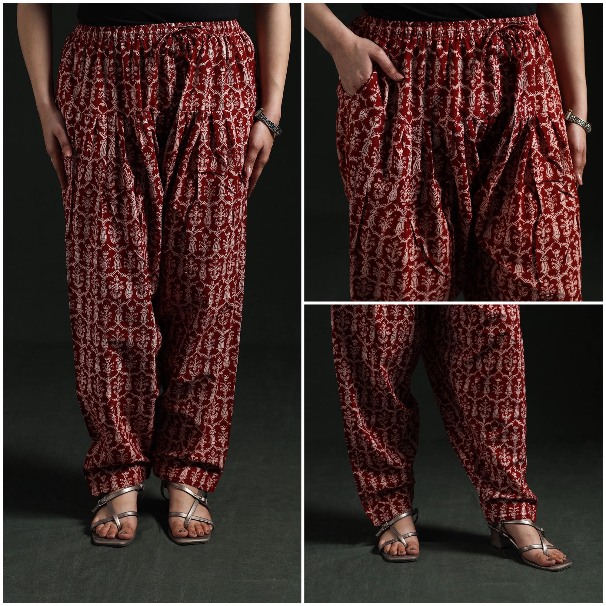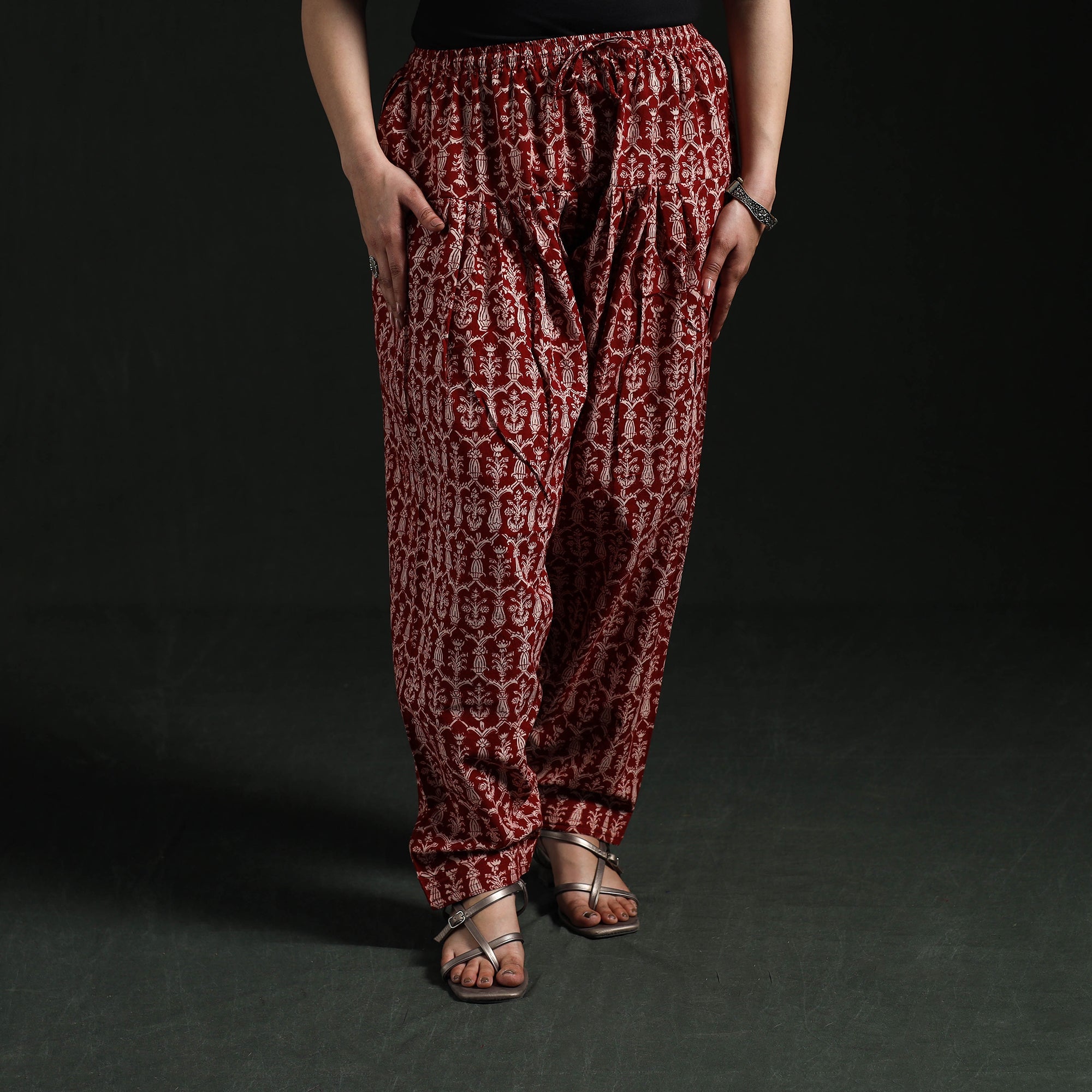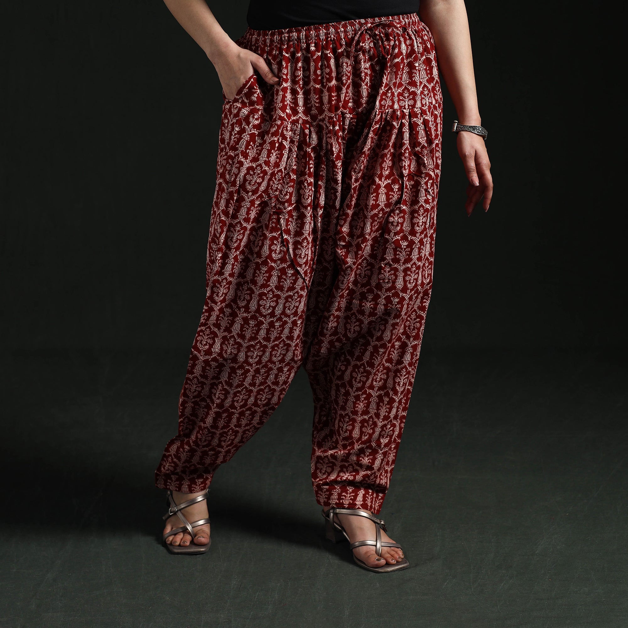 | Material | Bagh women’s salwar is crafted using traditional hand block printing and natural dyeing techniques from Madhya Pradesh, a craft that is over 300 years old. Made from pure cotton, it features an elasticated waist, drawstring and side pocket to ensure all-day comfort and practicality. Complete the look by pairing it with your favourite kurta. |