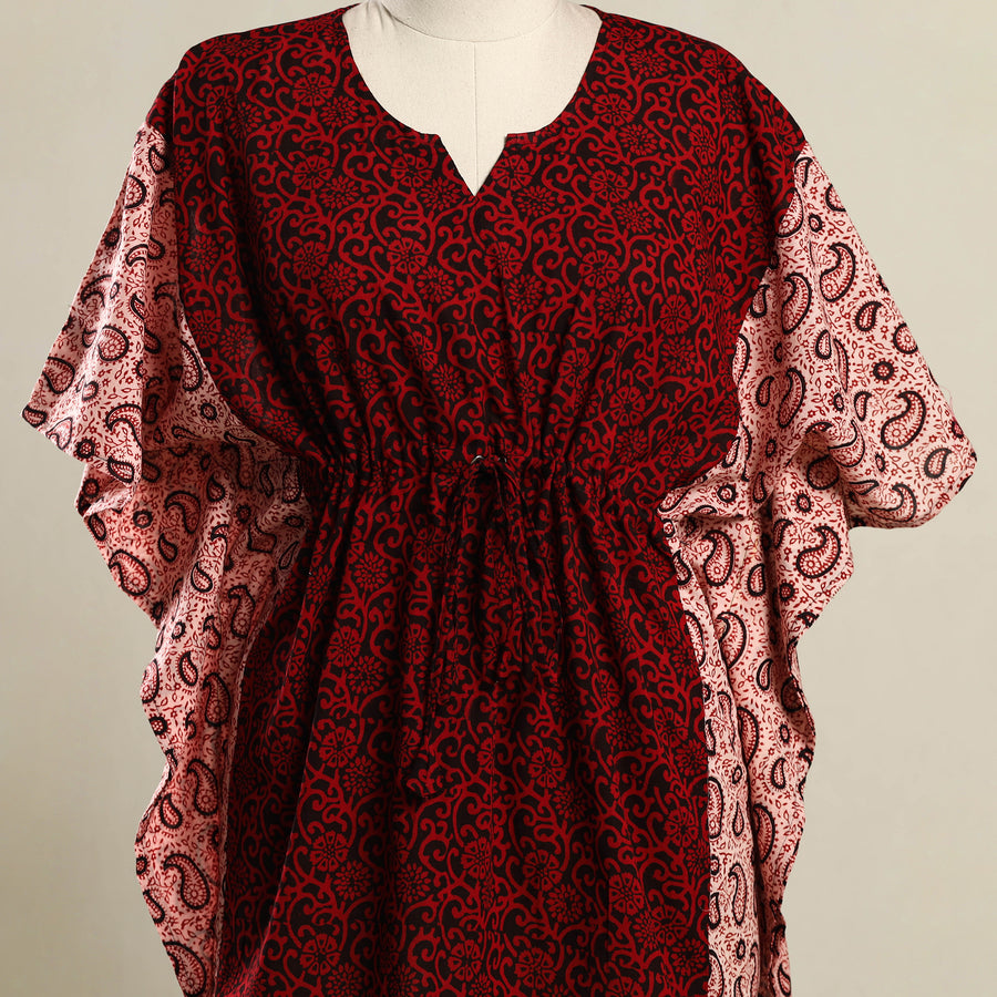 Stay comfy and stylish in this red bagh hand block print mosaic fusion cotton kaftan. The short loose fitting design features with long flowing sleeves offering comfort. The drawstring waist tie allows you to customize the fit to your shape. Perfect for casual outings beach days or lounging at home this kaftan adds a traditional yet fashionable touch to your wardrobe.