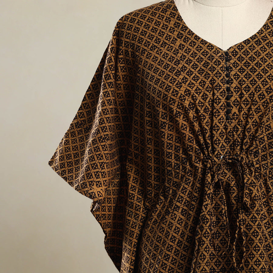 Stay comfy and stylish in this brown bagh hand block print cotton kaftan. The short loose fitting design features with long flowing sleeves offering comfort. The drawstring waist tie allows you to customize the fit to your shape. Perfect for casual outings beach days or lounging at home this kaftan adds a traditional yet fashionable touch to your wardrobe.