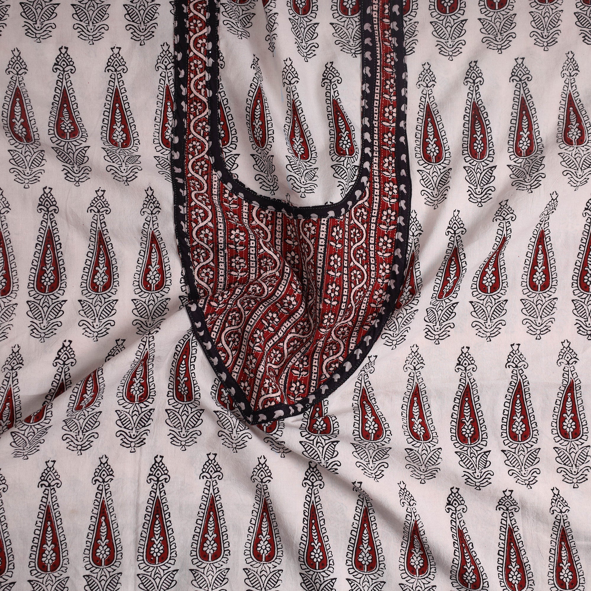 Bagh layouts are dramatic with the use of black and red alternately on a white background. Its production process is manually painstaking. Though the techniques and designs are age-old the prints retain their contemporary appeal.