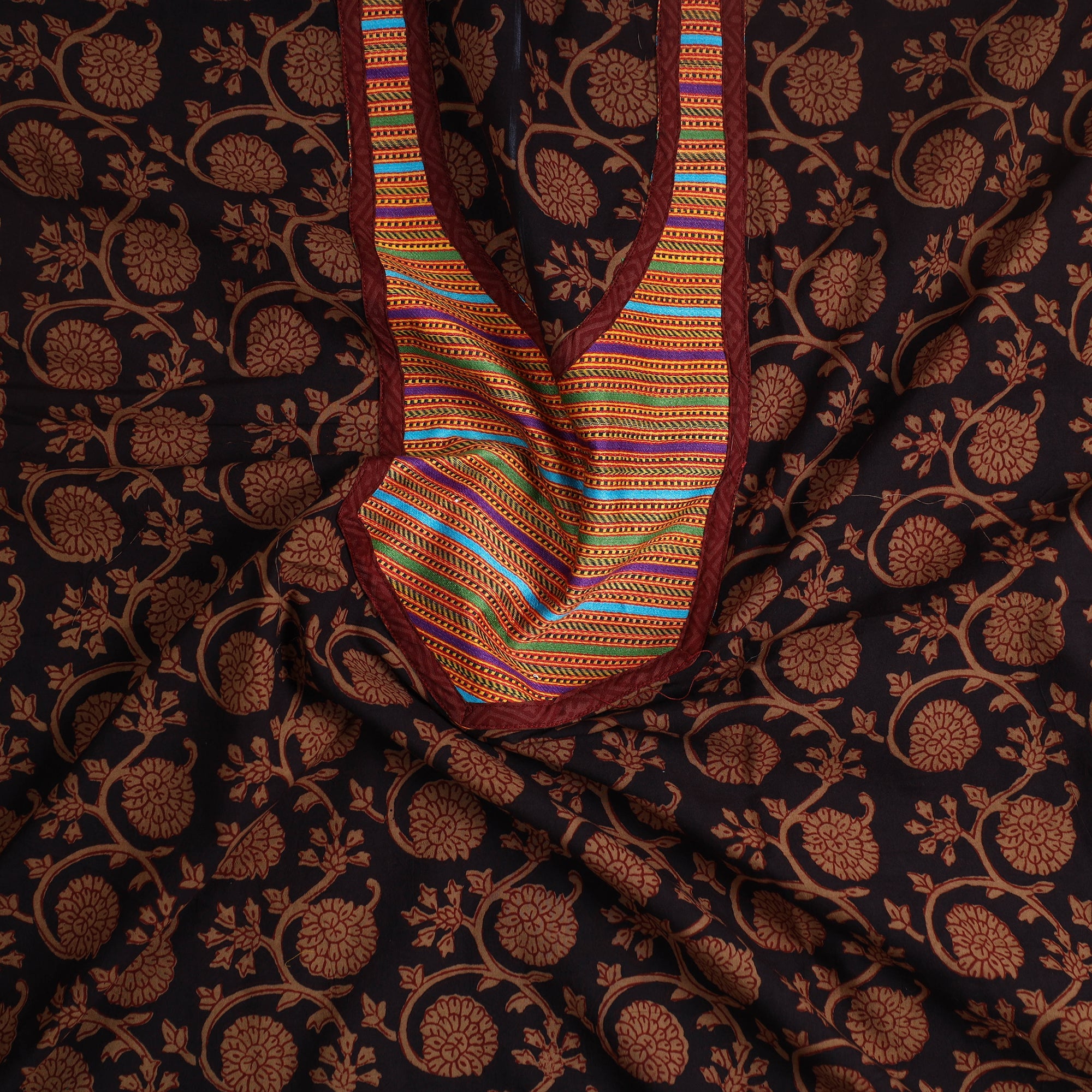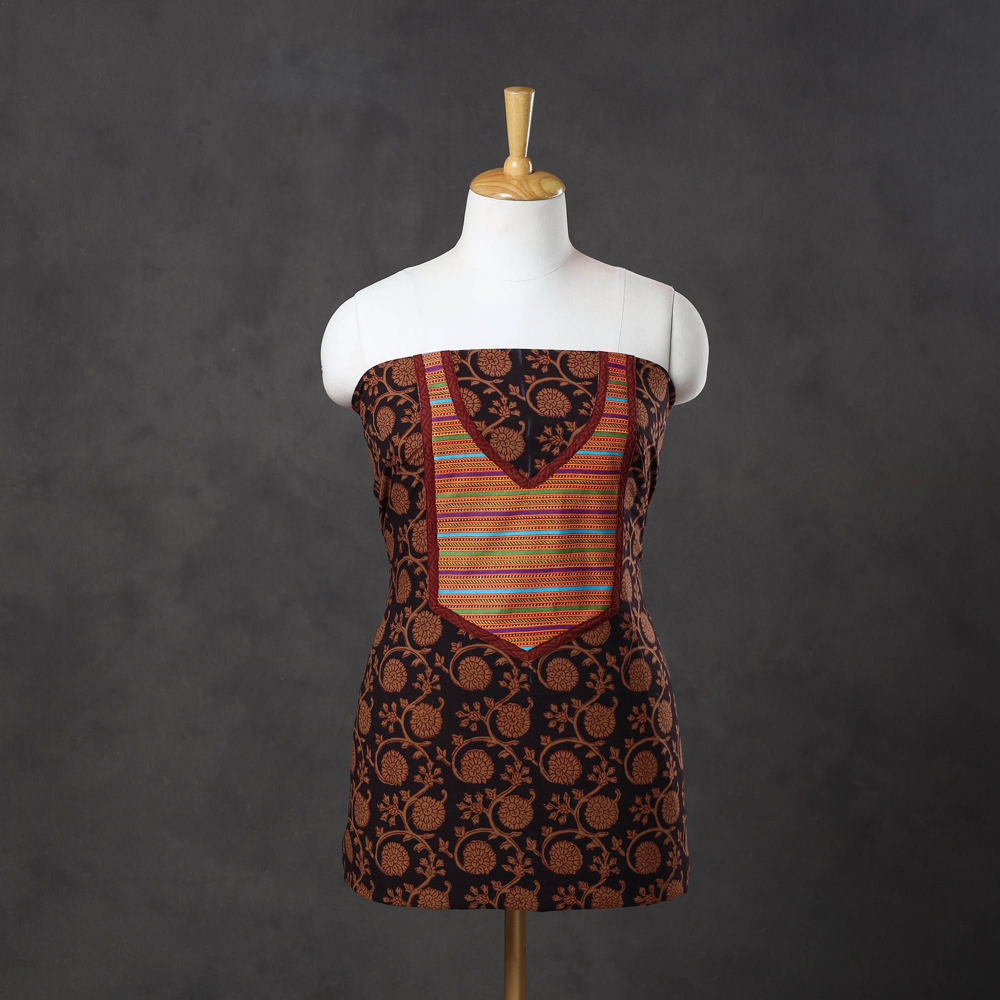 Embrace the rich tradition this brown bagh print cotton kurta material with patchwork, crafted by skilled artisans from Bagh, Madhya Pradesh. This fabric features intricate block-print that reflect India's cultural heritage. Known for its bold colors and detailed prints, making it an ideal choice for those who value both tradition and sustainability.