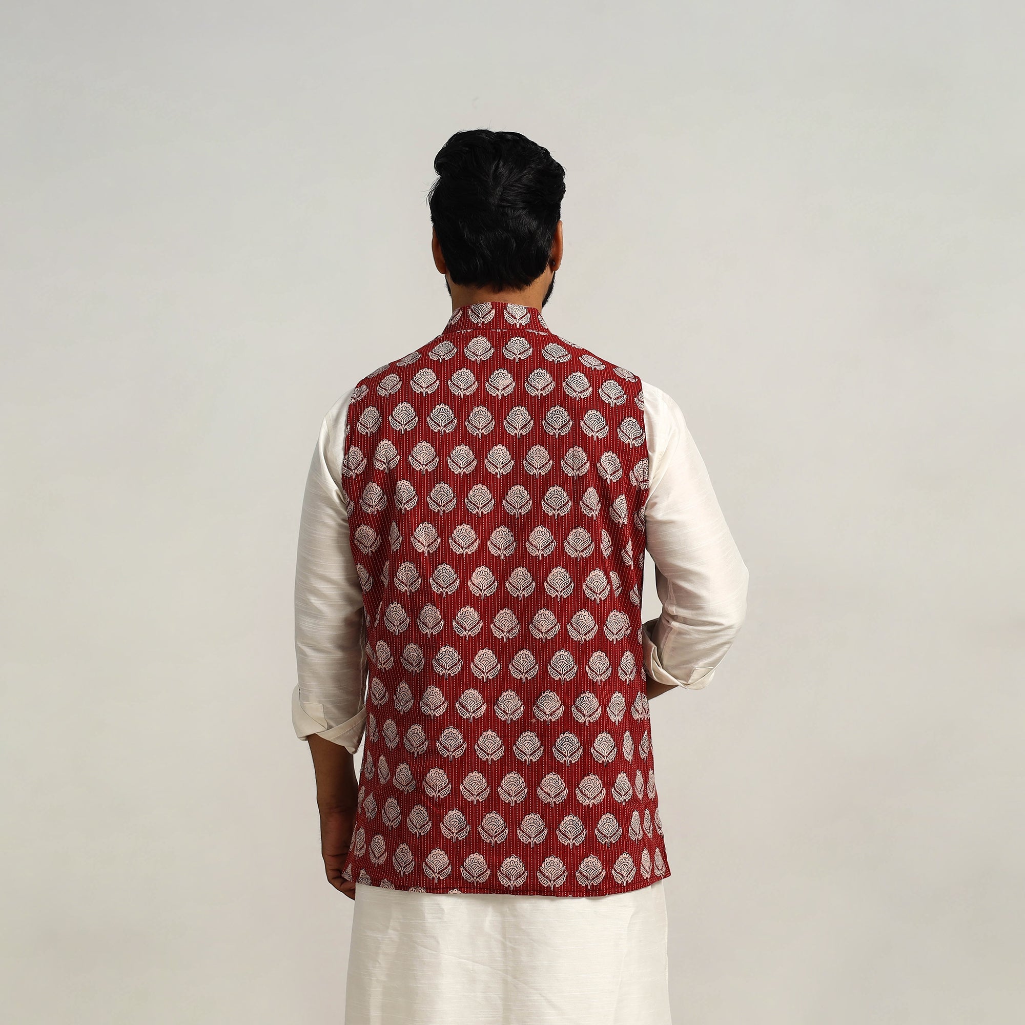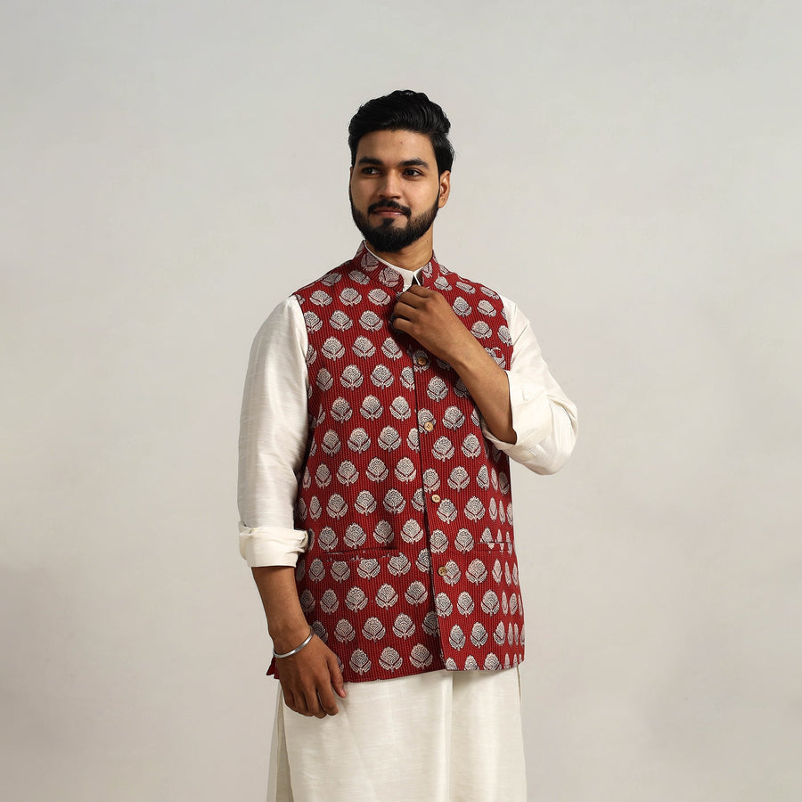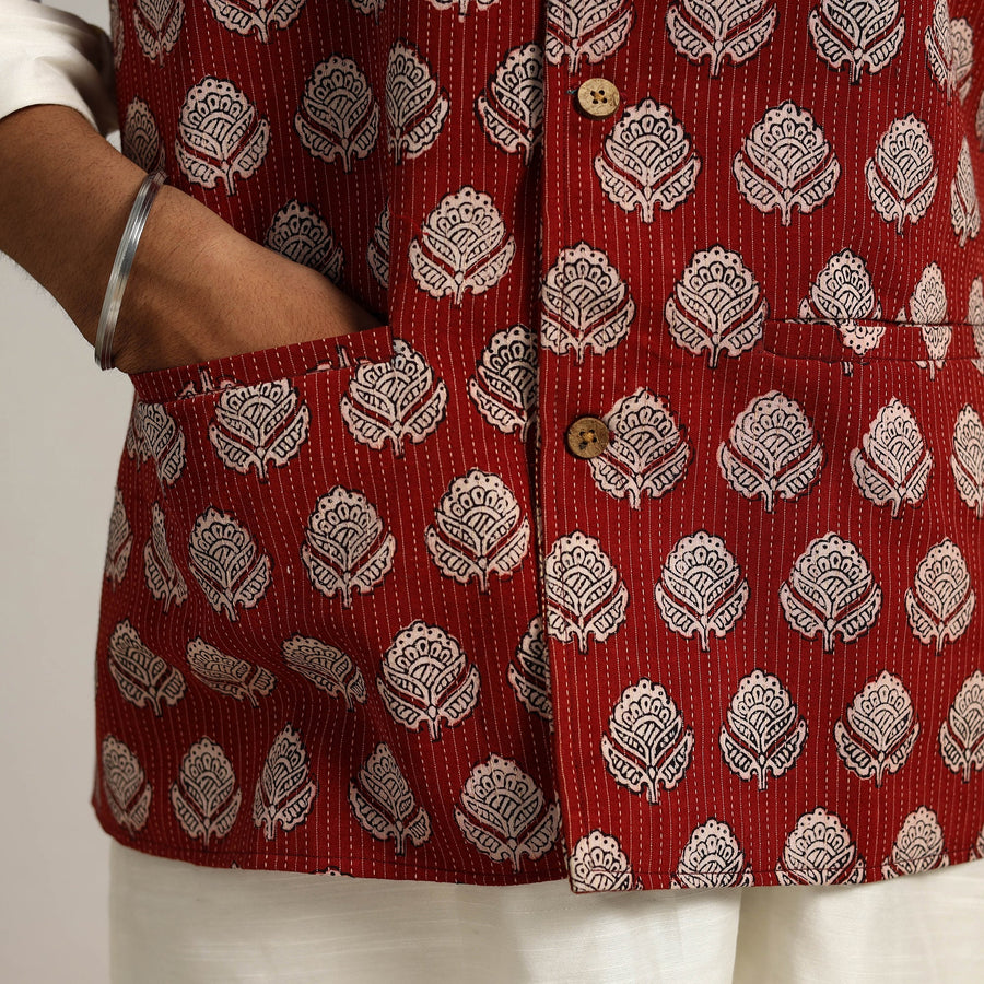 kantha style maroon bagh print nehru jacket. Made from high-quality bagh block-printed cotton, this sleeveless jacket features a stylish chinese collar and a full-button placket. The thoughtful design includes three outer pockets for added functionality. Providing comfort and elegant look. Perfect for both casual outings and special occasions.