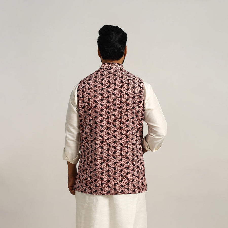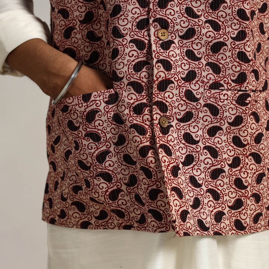 kantha style multicolor bagh print nehru jacket. Made from high-quality bagh block-printed cotton, this sleeveless jacket features a stylish chinese collar and a full-button placket. The thoughtful design includes three outer pockets for added functionality. Providing comfort and elegant look. Perfect for both casual outings and special occasions.